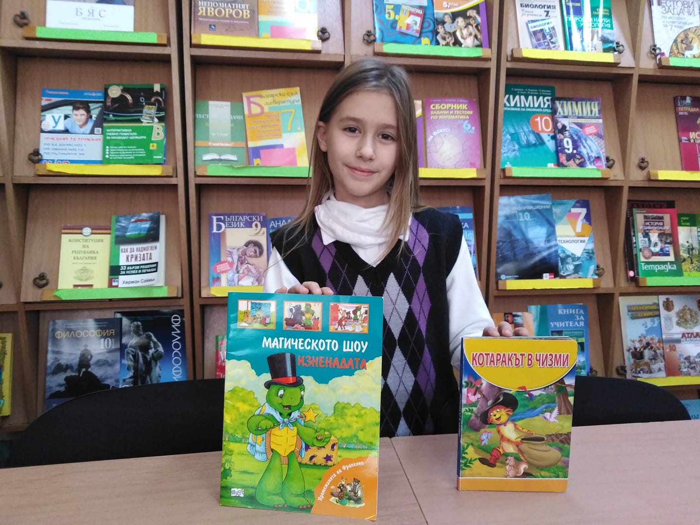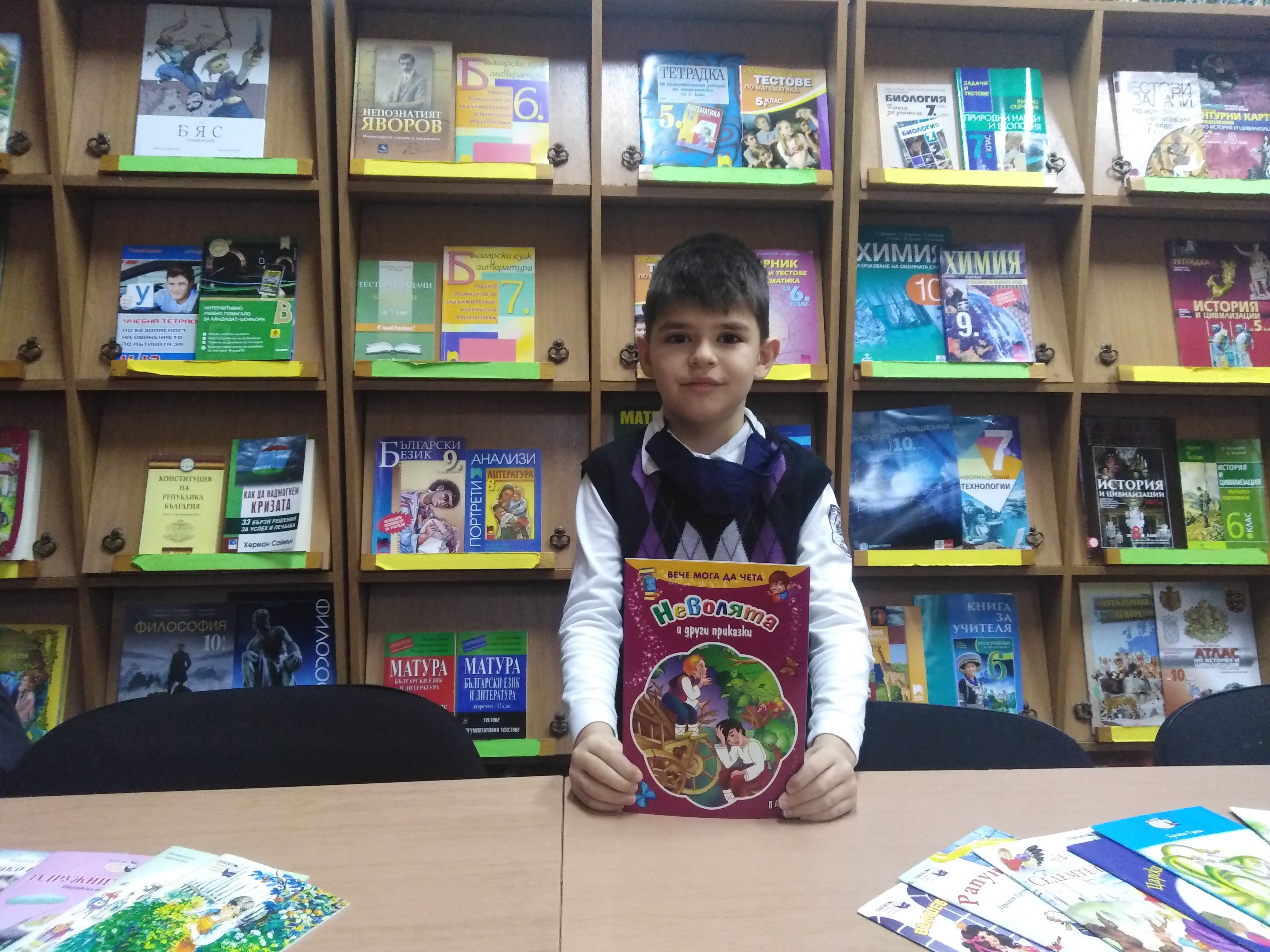 “Той е ученик в 1А клас, с класен ръководител г-жа Бистра Банева, и откакто е в училище, той е сред активните читатели на библиотеката! Марти е винаги любознателен и търсещ, обича да говори за своите многобройни книжки вкъщи. Благодарим ти, Марти!”