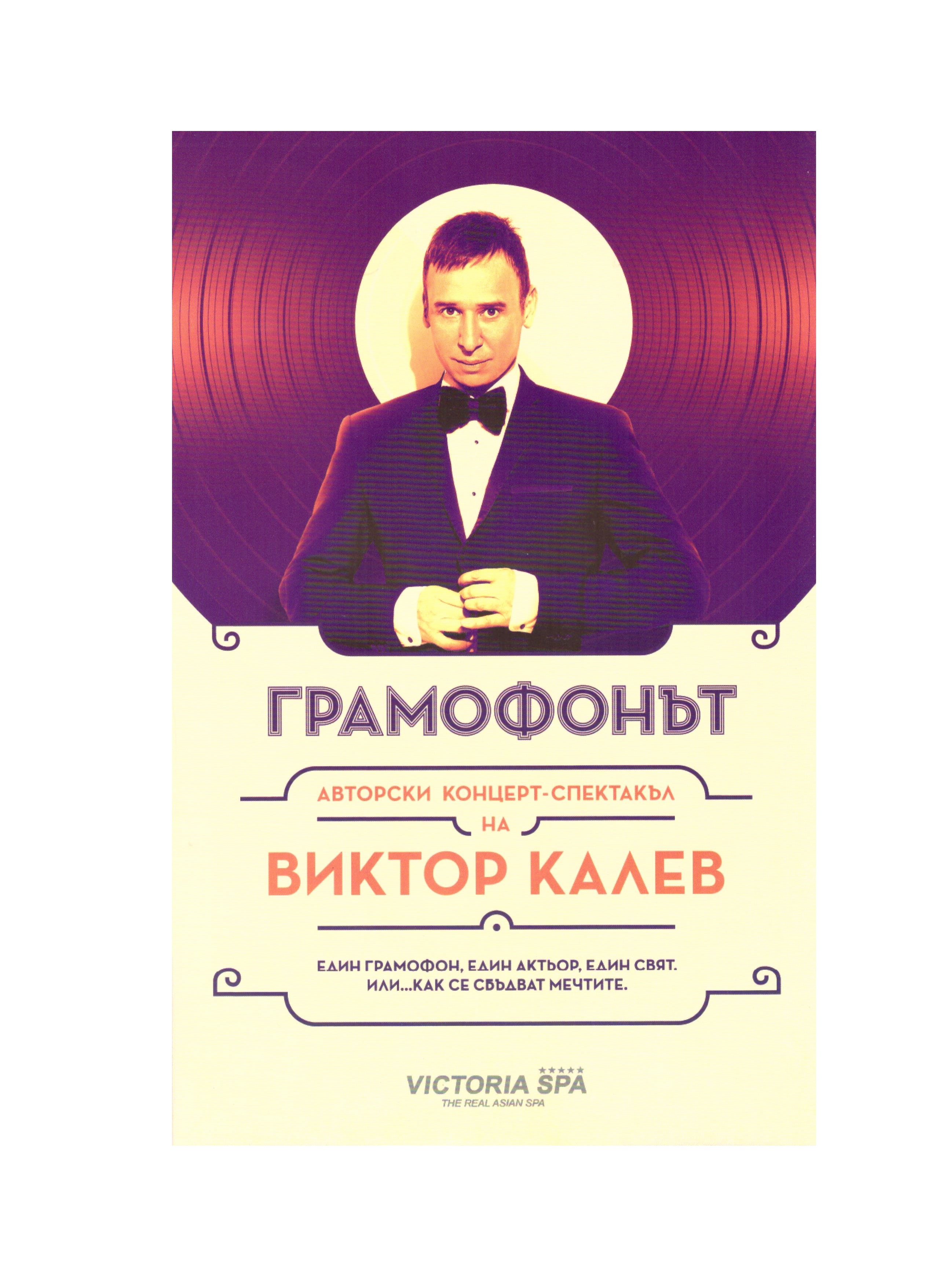 Концерт-спектакълът ,,Грамофонът“ се оказва емблематичен за целия му досегашен живот. Виктор Калев ще ни накара да се смеем с глас, да пеем така познатите на няколко поколения песни и да се забавляваме от сърце и душа.