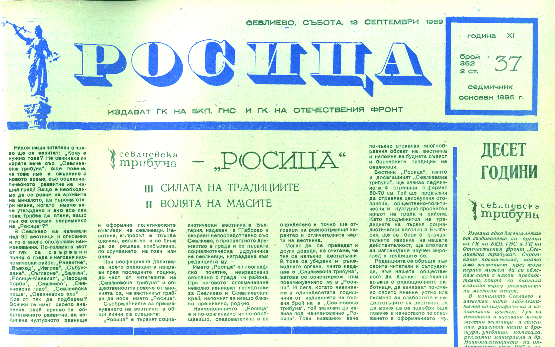 През 1959 година започва издаването на в. „Севлиевска трибуна, който е орган на ГК на БКП. В края на 1969 г. той продължава да излиза, но под наименованието „Росица“, което, според тогавашния главен редактор Илия Илийчев, е по-справедливо към социалистическите идеи на вестника.