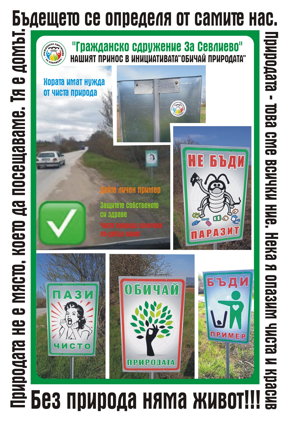 „Гражданско сдружение за Севлиево“ подкрепи инициативата на будни граждани за почистване на отсечката Севлиево-Сенник, с изработката на указателните табели, които поставихме на 16 април в този участък. Надяваме се, че виждайки ги, повече хора ще се замислят, преди да изхвърлят боклука си през прозореца на колата.