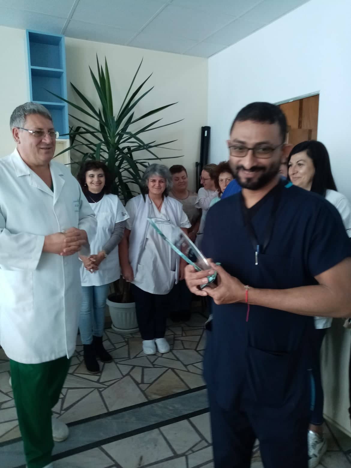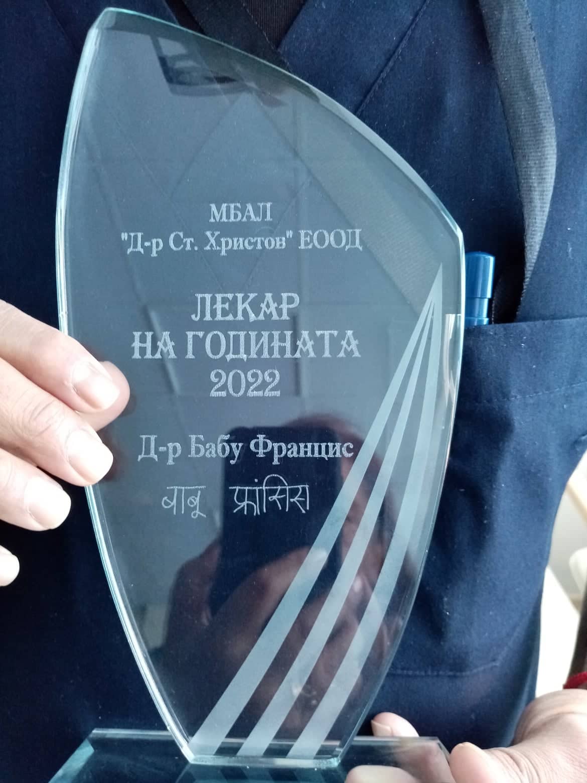 “Благодаря на д-р Цеков и на колегите за огромното уважение и признание към мен, като чужденец в колектива на болницата. Това е първата ми награда като лекар, след като вече имам и специалност. Всеки от моите колеги можеше да получи тази награда, но те избраха мен. Благодаря им!”, заяви д-р Бабу и допълни, че се чувства много добре в болницата, независимо, че е чужденец. Той остана приятно изненадан, че на плакета е изписано “Лекар на годината 2022” и на хинди – официалният език в Индия.