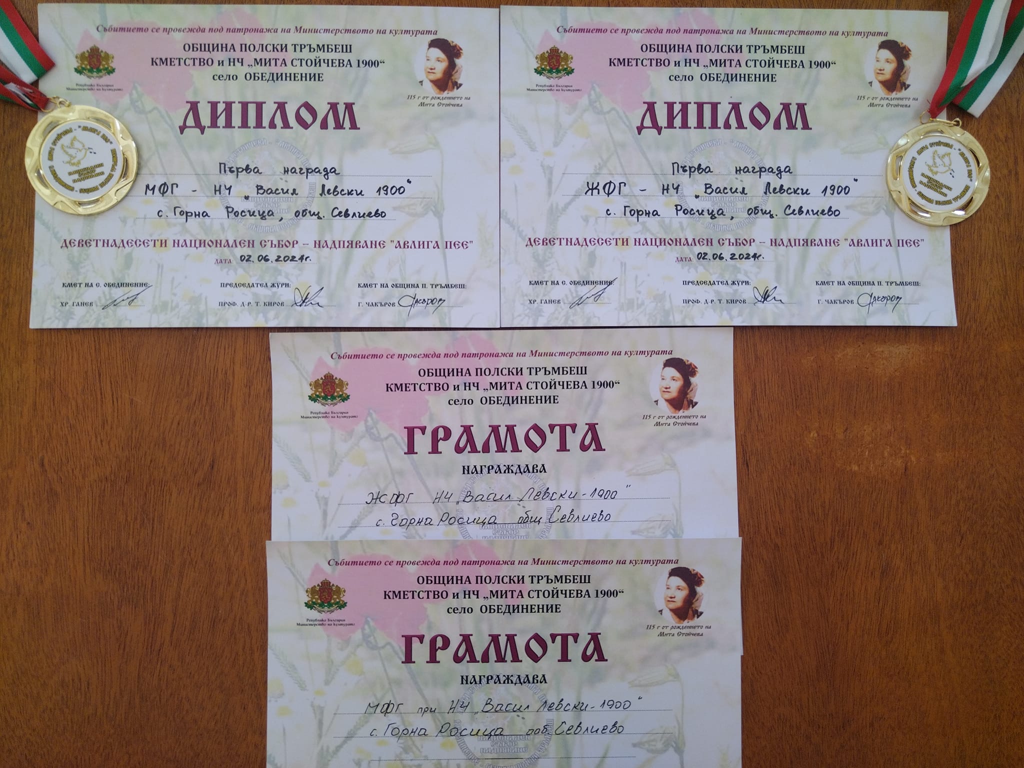Изпълнителите спечелиха диплом и златен медал. Със златен медал от с. Обединение за индивидуалното си изпълнение спечели и читалищният секретар Цанка Сярова.