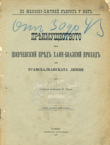 Докладът, публикуван на 8 февруари 1897 г., с заглавие „Шипченский проход и Хаинбоязкий за Балканската линия“, представя три основни проекта. Първият маршрут преминава през прохода Хаинбозад (днешния Проход на Републиката), вторият предвижда тунел под прохода Шипка, а третият е Източното трасе, преминаващо през Търново, Елена и Сливен. Поради преминаването на Източното трасе през малко населена територия, то е изоставено като неконкурентоспособно. Вниманието е насочено към Западното трасе, което свързва важни селища като Севлиево, Габрово и Казанлък, и така получава предпочитание за реализация.