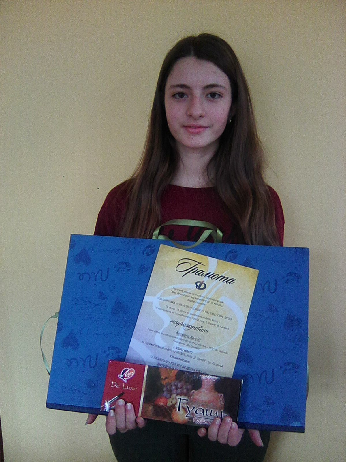 Графичната рисунка на 12-годишната Кремена Колева бе класирана на второ място във втората възрастова група. За своя цветен натюрморт Стелиян Стоянов получи специалната награда на Ротари клуб в Стара Загора. Вече порасналата сестра на 8-годишния художник, бивша възпитаничка на преподавателката Ива Русинова Михаела Стоянова, получи диплома за отличен успех в училището, където тази година завършва 12 клас, специалност „Дизайн“.