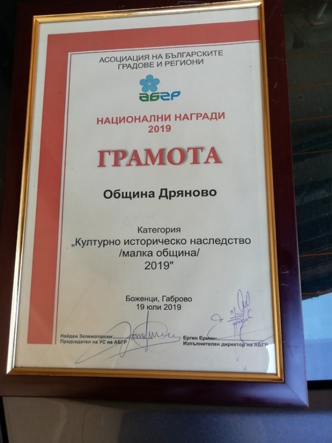 Трето отличие за трета поредна година бе присъдено на Дряново от Асоциацията на българските градове и региони. Това стана по време на проведената Традиционна годишна среща на представителите на изпълнителната власт в България, която се проведе преди дни в Габрово. На официалната церемония, Асоциацията присъди на Община Дряново националната награда Община №1 за 2019 г. в категорията “Културно-историческо наследство”. Инж. Мирослав Семов прие наградата с радост и удовлетворение от постигнатото, но и с ангажимент за още повече усилия в работата по развитие и облагородяване на дряновската община.