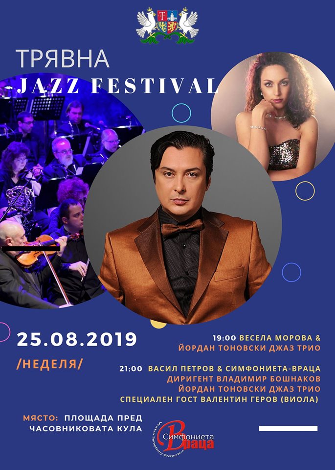 На 25 август (неделя), на площада пред часовниковата кула на град Трявна ще се проведе първият джаз фестивал в града. Вечер, в която ще звучи красив вокален джаз, изпълнен от млади и талантливи изпълнители, които ще представят своите нови проекти и утвърдени имена от Българската джаз сцена. За първото издание на фестивала, община Трявна е поканила младата и талантлива джаз певица Весела Морова и един от най-популярните и красиви гласове на България, Васил Петров, който ще представи новия си проект симфоничен джаз.