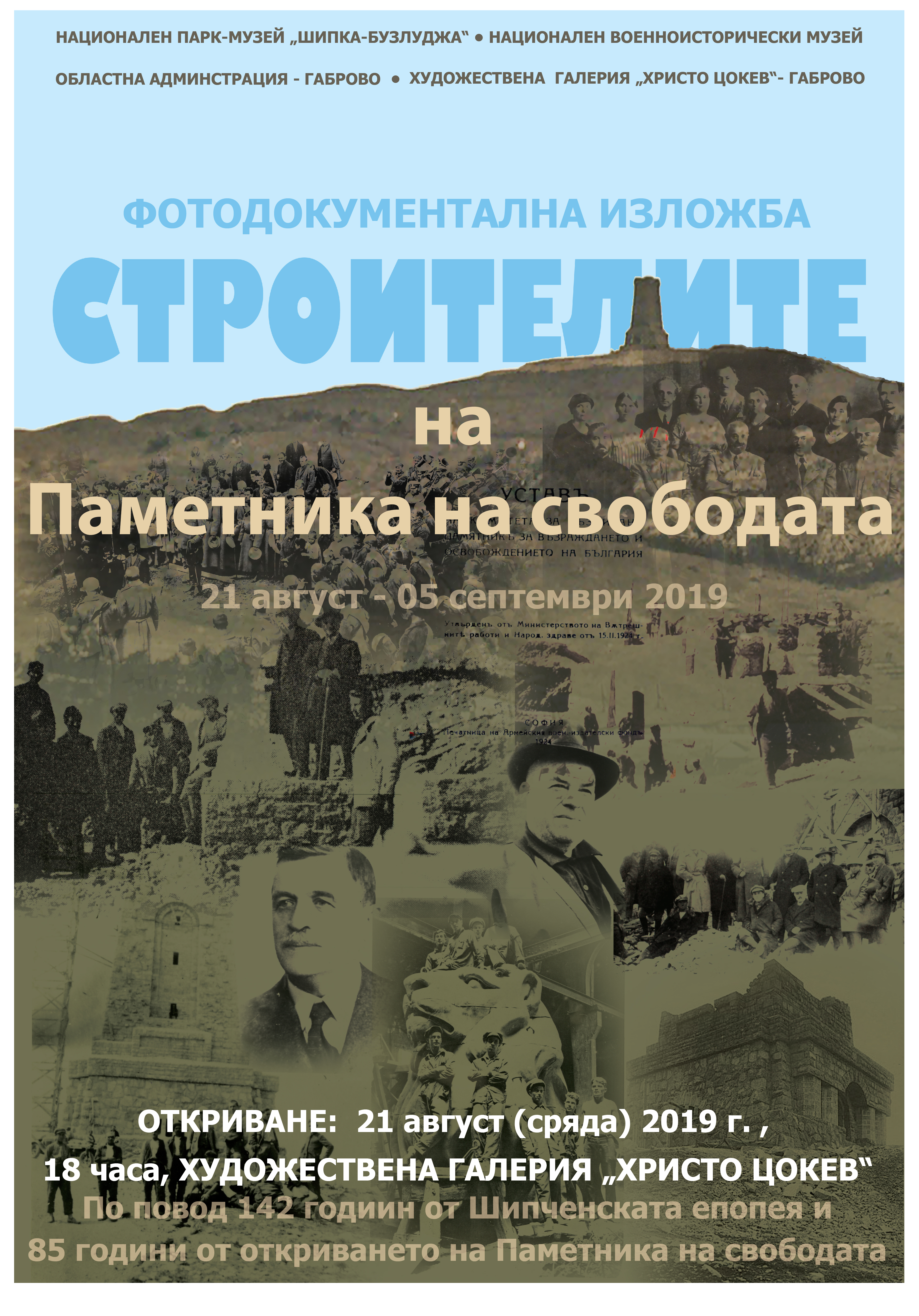 Началото на тържествата, посветени на Шипченската епопея, ще бъде поставено на 21 август в Габрово, когато ще бъде открита изложбата „Строителите на Паметника на свободата“. Изборът за това събитие не е случаен, защото през настоящата година освен 142 години от епичните боеве, отбелязваме и 85 години от откриването на най-величествения монумент – Паметника на възраждането и освобождението на българския народ на връх Св. Никола, който всички днес наричаме Паметник на свободата. Фотодокументалната изложба е по инициатива на националния парк-музей „Шипка-Бузлуджа“, а неин символичен домакин в Габрово е художествената галерия „Христо Цокев“, със съдействието на областната администрация.