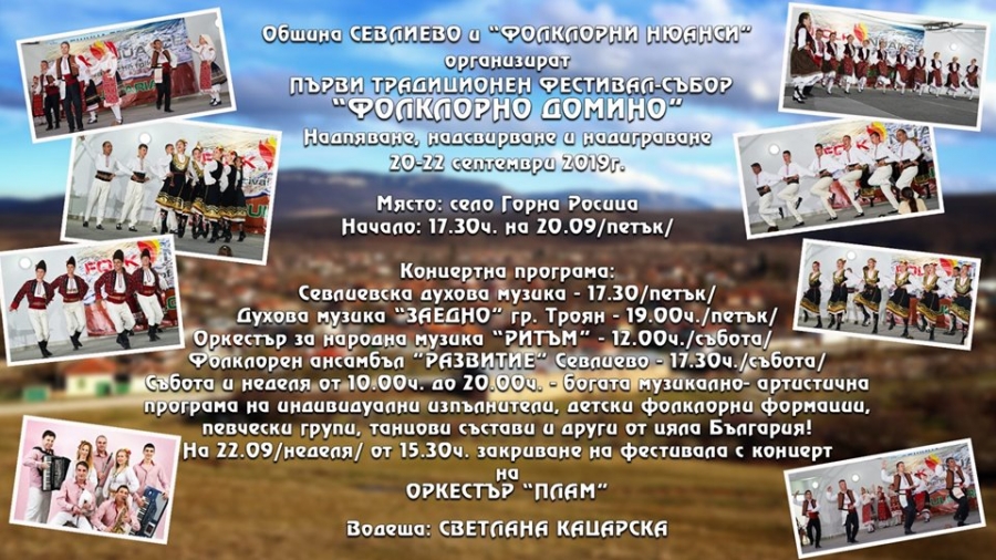 От 20 до 22 септември 2019 г. в село Горна Росица в Община Севлиево ще се проведе първото издание на Традиционния фестивал – събор „Фолклорно домино“. Събитието ще е уникално по рода си, а участие в него ще вземат певчески групи, инструментални формации, танцови състави и индивидуални изпълнители от цялата страна. Фестивалът има за цел да съхранява, популяризира и разпространява българските фолклорни традиции, като част от националната ни идентичност, както и да открива млади фолклорни таланти.