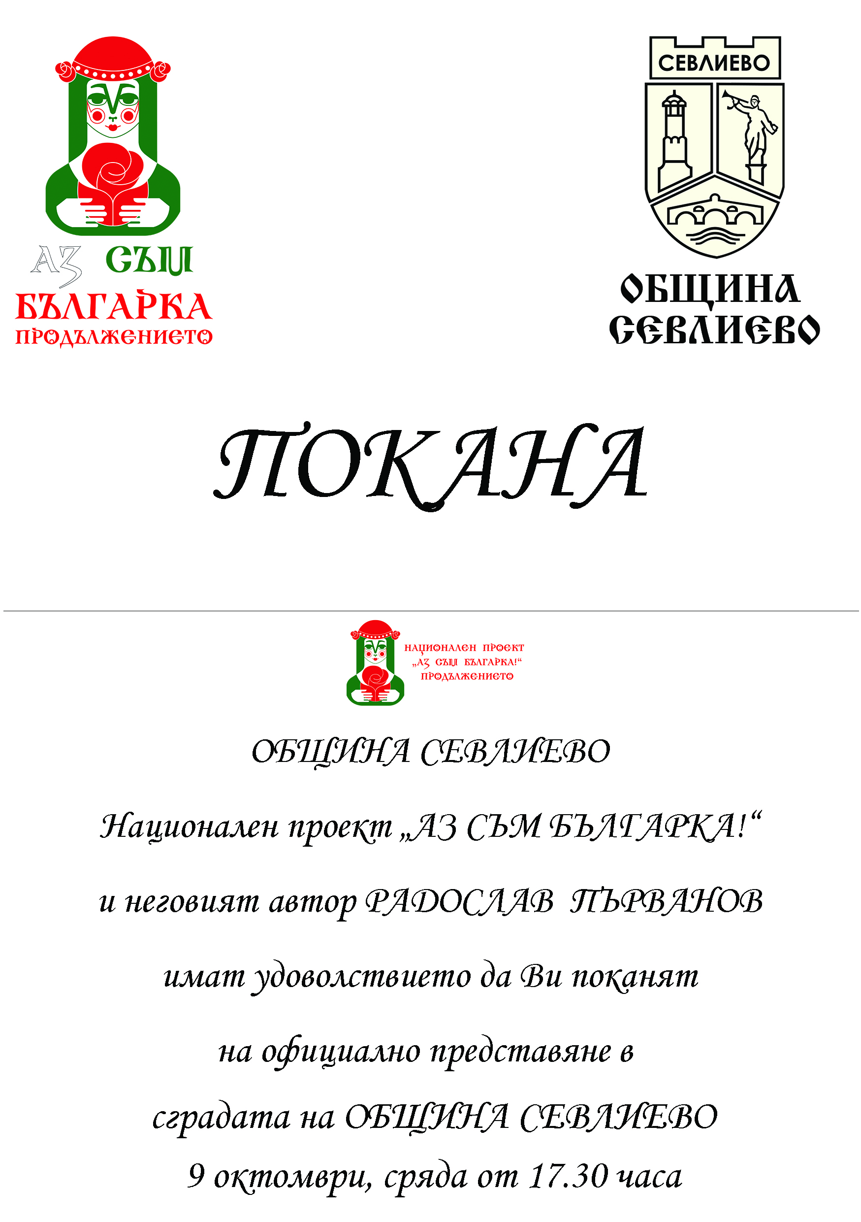 Авторът Радослав Първанов, участниците и любезните домакини от Община Севлиево, ви очакват на 9 октомври на официалната премиера на втората част от Национален проект „Аз съм Българка!“. Прекрасна възможност да се потопите в една различна българска атмосфера и да видите красотата на заобикалящата ни родна история под различен ъгъл.