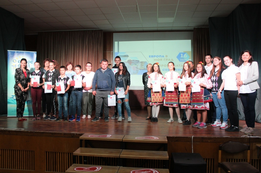 В надпреварата „Селфи с Европа“ участваха три отбора от СУ „Васил Левски“ и един от ПГ „Марин Попов“. Победител в състезанието стана отборът на СУ „Васил Левски“ с ръководител В. Събчева. Журито остана впечатлено и от децата от 6 клас на СУ „Васил Левски“ с ръководител Д. Димитрова, които останаха на второ място. На тях бе връчена поощрителна награда. И четирите отбора получиха грамоти за участието в конкурса.