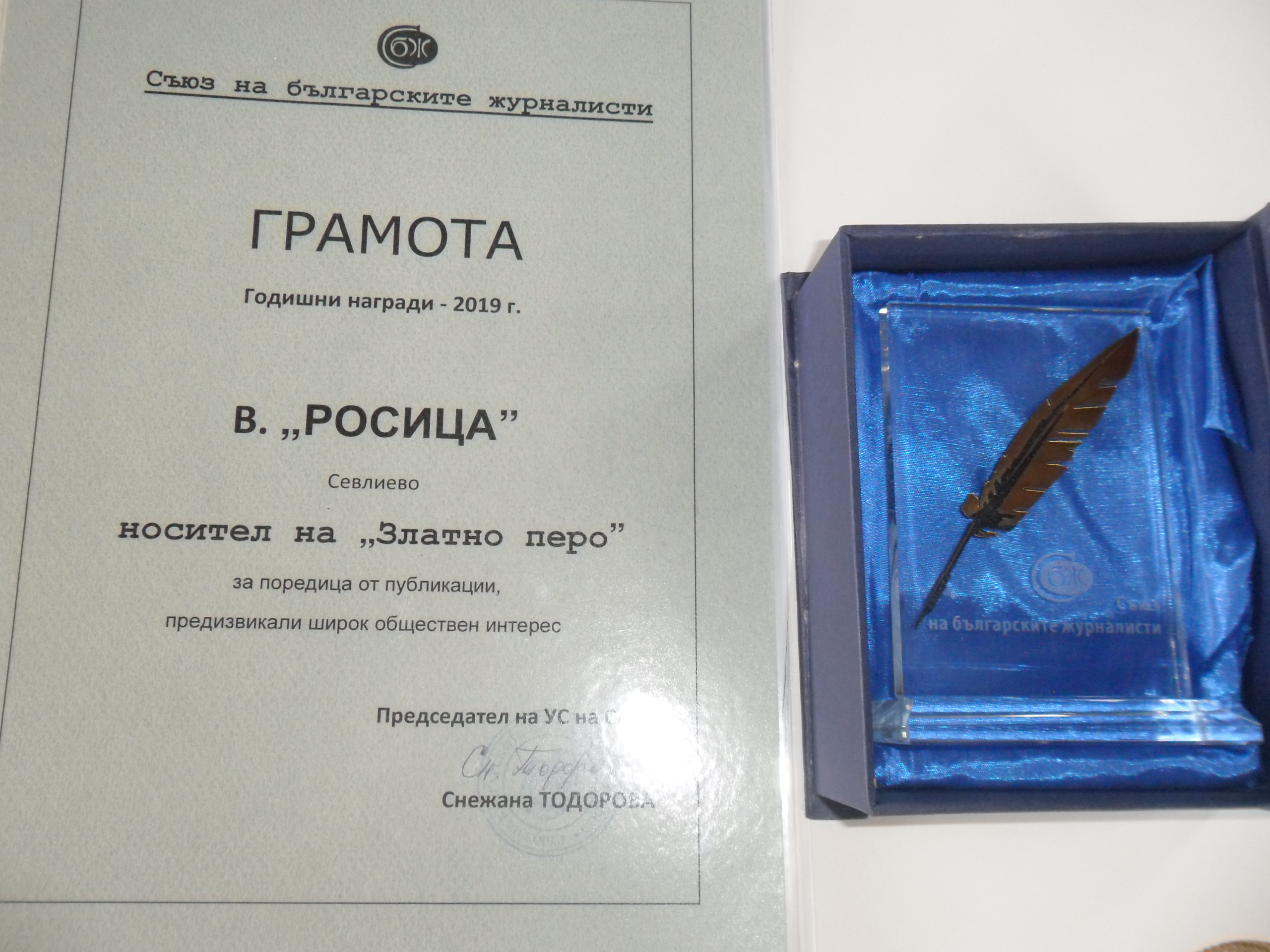 Екипът на в.”Росица” получи единствената награда за регионална медия „Златното перо” на тазгодишните награди на Съюза на българските журналисти. Това стана на официална церемония на 1 ноември – „Ден на народните будители” в сградата на СБЖ. Бяха раздадени награди в 13 категории на журналисти и екипи в радио, и телевизионната журналистика, на млади журналисти и автори на книги. Раздадени бяха и пет специални награди. Наградата „Йосиф Хербст” за цялостен принос в журналистика беше дадена на Дамян Обрешков, журналист, публицист, писател, дългогодишен главен редактор на вестниците „Отечествен фронт” „Учителско дело, „Труд” и „Поглед”.