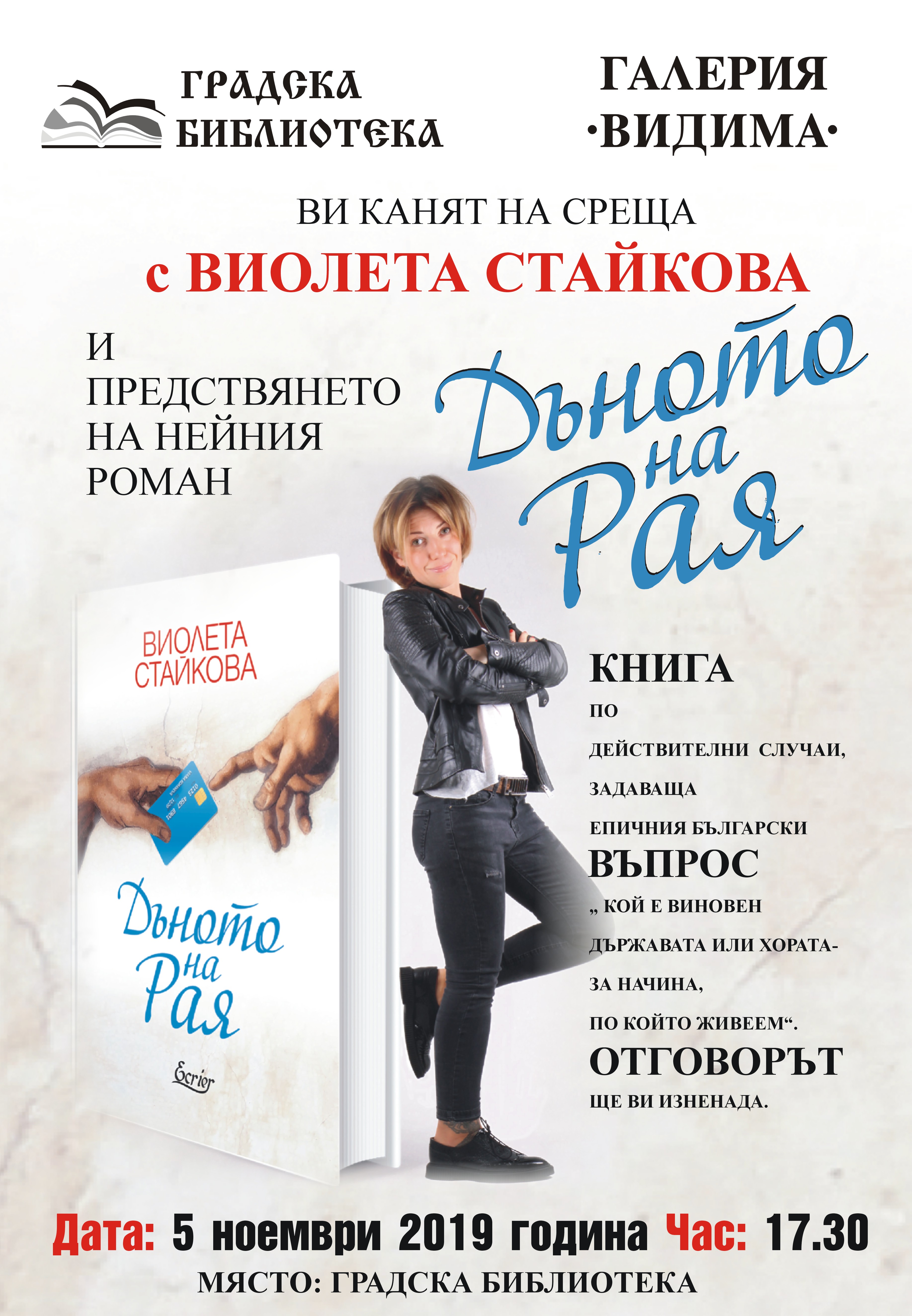 Поредният млад и талантлив автор ще бъде представен в Градската библиотека. На 5 ноември, севлиевските ценители на книгата ще могат да се запознаят с авторката на „Дъното на Рая“ – Виолета Стайкова.