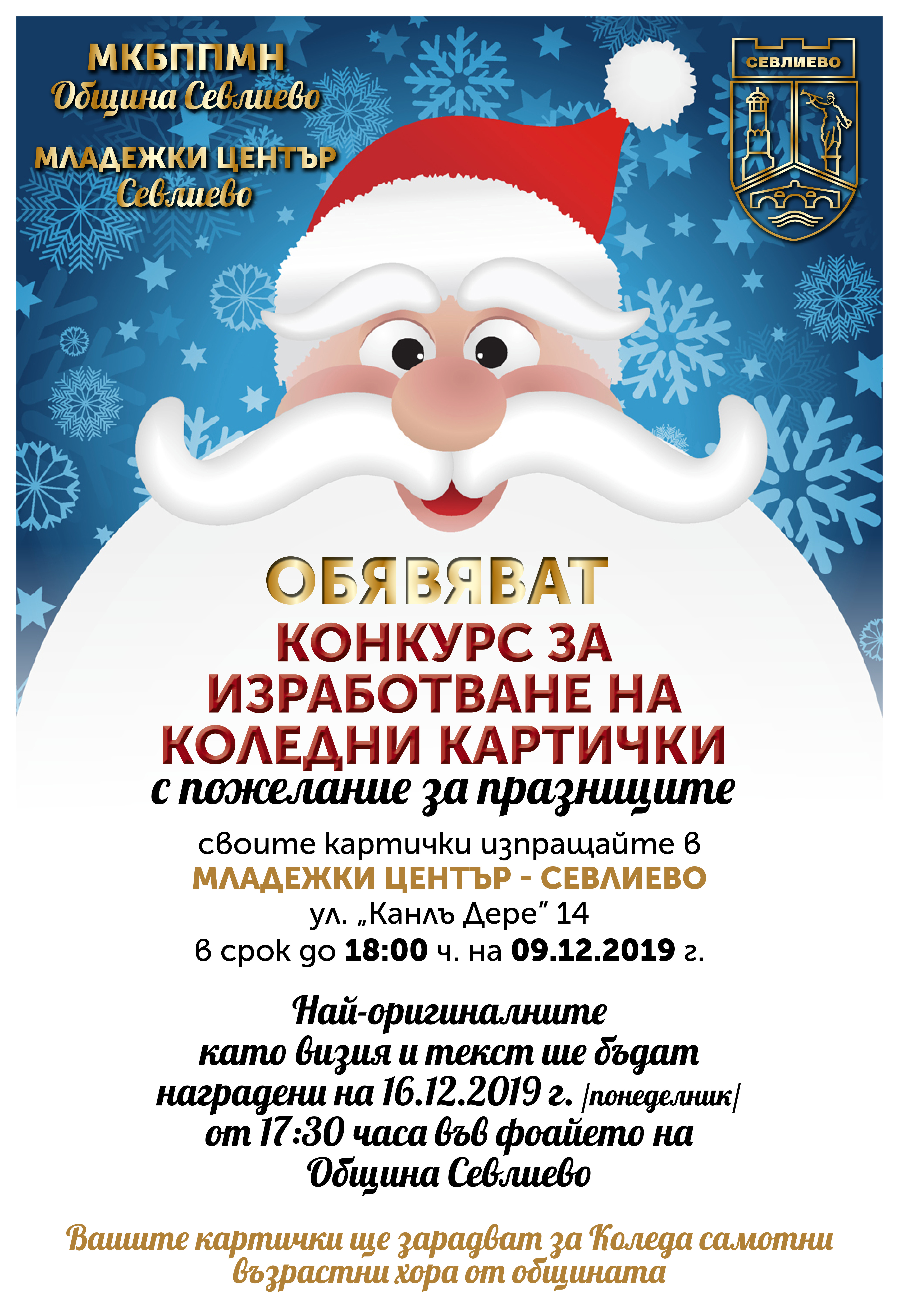 За осма поредна година Местна комисия за борба срещу противообществените прояви на малолетните и непълнолетните (МКБППМН) в Община Севлиево и Младежки център – Севлиево организират конкурс за коледна картичка. В конкурсът могат да се включат всички деца и младежи на територията на общината. Целта на инициативата е да се провокира желание у подрастващите да изработят коледна картичка, която да бъде изпратена на самотен човек от Община Севлиево. Участниците в конкурса ще бъдат ангажирани в дейност, която ги насочва към положителен модел на поведение и разбиране на другия, както и превенция на асоциалното поведение на малолетните и непълнолетните. Конкурсът е индивидуален, а участниците ще бъдат класирани в няколко възрастови групи – предучилищна възраст – деца до 6 години, първа възрастова група – от 7 до 10 години, втора възрастова група – от 11 до 15 години, трета възрастова група – от 16 до 19 години.