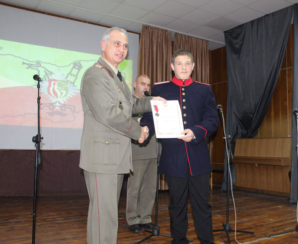 Единадесетокласникът от СУ „Васил Левски“ отвърна подобаващо – рецитира стихове на Ботев и Вазов и подари на присъстващите военни две книжки, съставени от него и съученика му Борислав Маринов