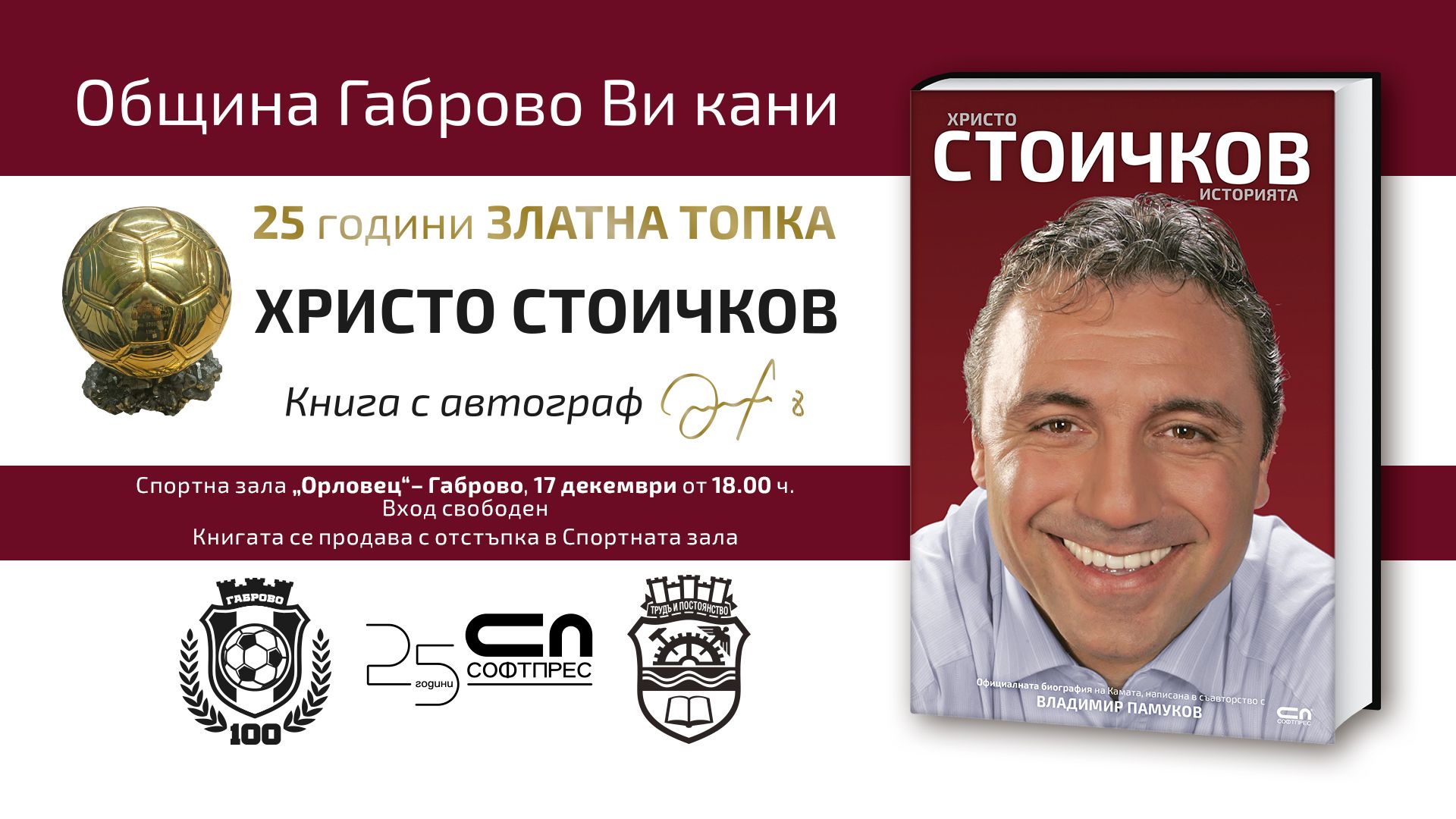 Футболната легенда Христо Стоичков гостува днес в Габрово. От 18 часа в спортна зала „Орловец“ той ще представи официалната си биография – „Христо Стоичков. Историята“, написана в съавторство с журналиста Владимир Памуков. След това ще отдели време, за да подпише лично и с персонално послание всяка една от книгите си, които ще бъдат закупени. Събитието „25 г. Златна топка. Христо Стоичков – книга с автограф“ ще сложи и своеобразен финал на поредицата инициативи тази година, посветени на 100-годишнината от първия футболен мач, игран в Габрово.