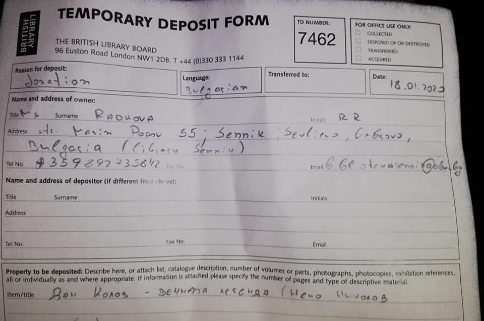 Може да се каже, че пътят на книжката от родното село на Дан Колов до най-голямата библиотека на острова е предначертан. Когато преди дни библиотекарката от сеннишкото читалище Росица Радкова тръгва за Лондон, без да се замисли или поколебае дори за миг, слага в куфара си и ценното издание. Още в същия ден, пристигайки в британската столица, тя се отправя към библиотеката, за да дари книжката, хвърляща нова светлина върху живота на Дан Колов. Дарението й е прието сърдечно и веднага е заведено във фонда на библиотеката.