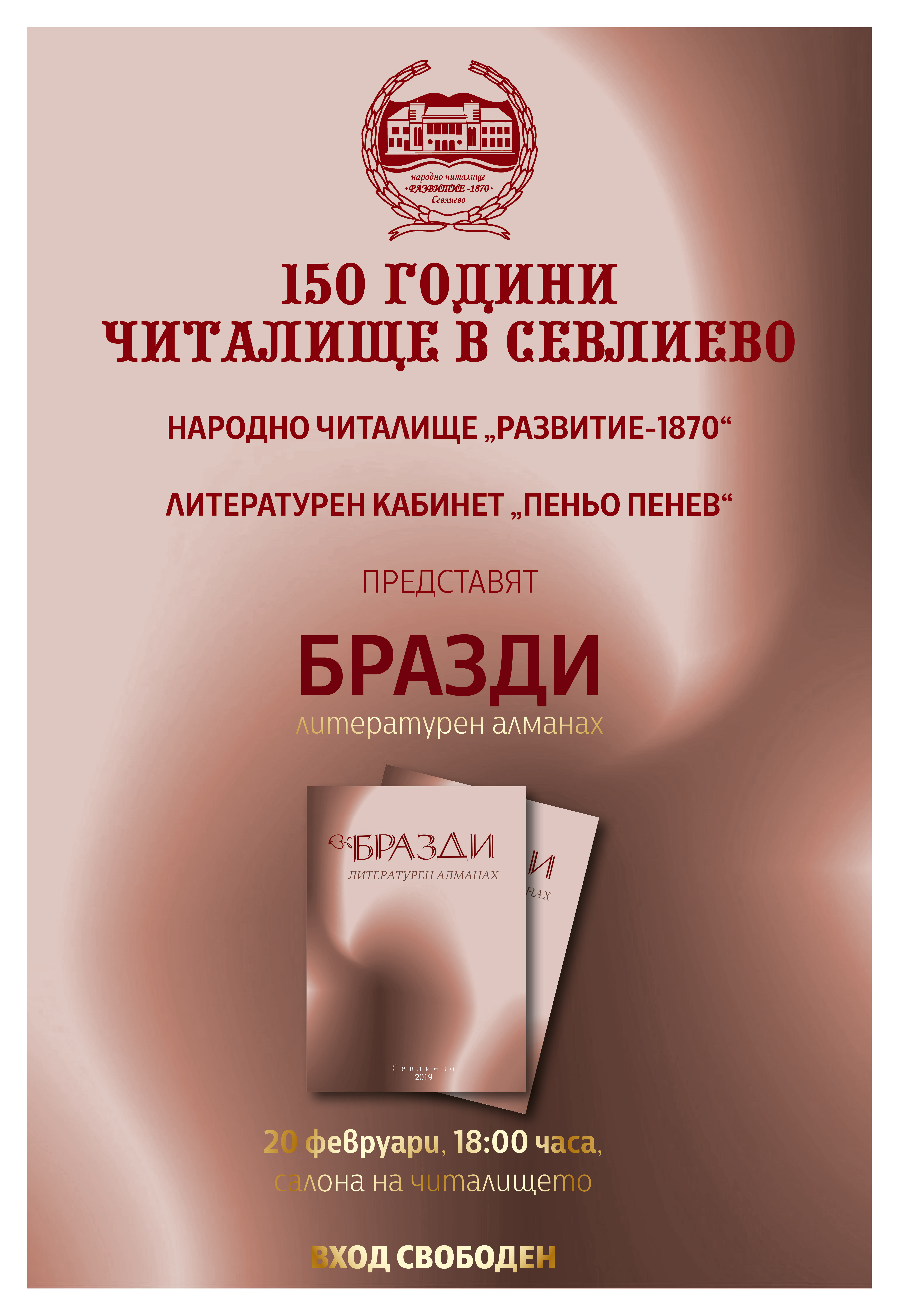 Серия от събития съпътстват 150-ата годишнина от създаването на НЧ „Развитие – 1870“ в Севлиево. Едно от тях е представянето на литературния алманах „Бразди“, което ще се състои утре – 20 февруари, от 18:00 часа в големия читалищен салон.