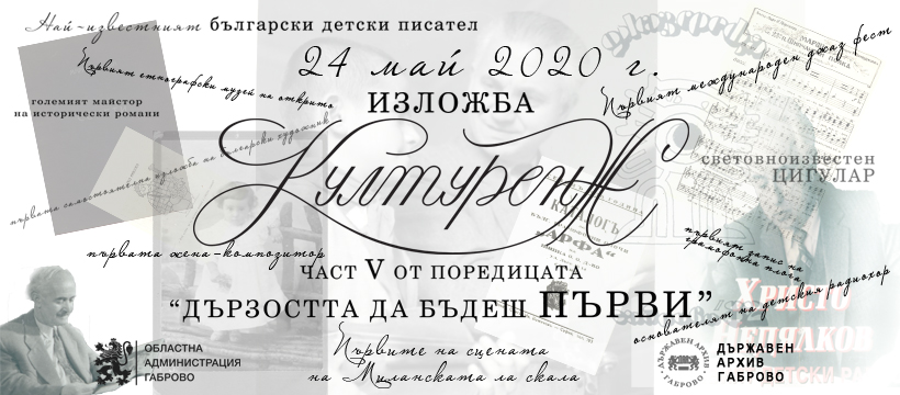 С витруално откриване на изложбата „Културен жест“ Областна администрация – Габрово отбеляза 24 май – Денят на българската просвета и култура и на славянската писменост. Изложбата е част V от поредицата „Дързостта да бъдеш първи“, в която този път са представени бележити личности от Габрово и Габровска област, свързани с културата в различните й аспекти и са били първи в своето направление. „Вярвам, че наш дълг е да помним тези личности и да предаваме на своите деца историята на техните достижения. Така ние съхраняваме родовата памет, но и издигаме самочувствието си, че „и ний сме дали нещо на света“ – сподели областният управител Невена Петкова и допълни, че изложбата този път няма да бъде открита физически, макар че вече е подредена в сградата на Областна администрация, а е представена по интересен начин на официалната страницата на администрацията във фейсбук.