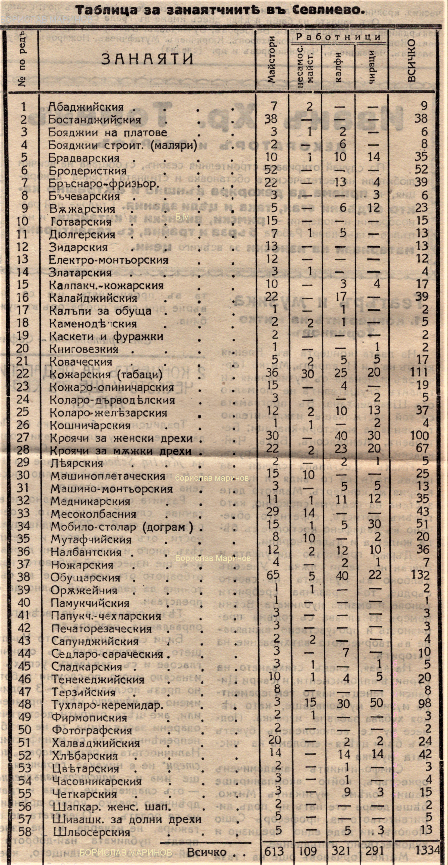 След Освобождението в града възникват предпоставки за още по-засилено производство и упражняване на нови занаяти, но също така се наблюдава и постепенно замиране на някои от тях. Занаятите се поддържали както наследствено – от баща на син, така и от дошлите от селата чираци. След идването си в града, те постепенно усвоявали даден занаят и ставали майстори, пренасяли се в града, ставали по-заможни и вече с право се наричали “граждани”. По този начин се увеличавало естествено и населението на града. Според данните от първото преброяване на населението в България от 31 декември1880 г., жителите на град Севлиево били 8 373. За да се доближим максимално до броя на жителите от 1929 г., от когато е и приложената таблица на занаятчиите, давам данните от преброяването за 1926 г. – според което севлиевци вече са 9 325 души.