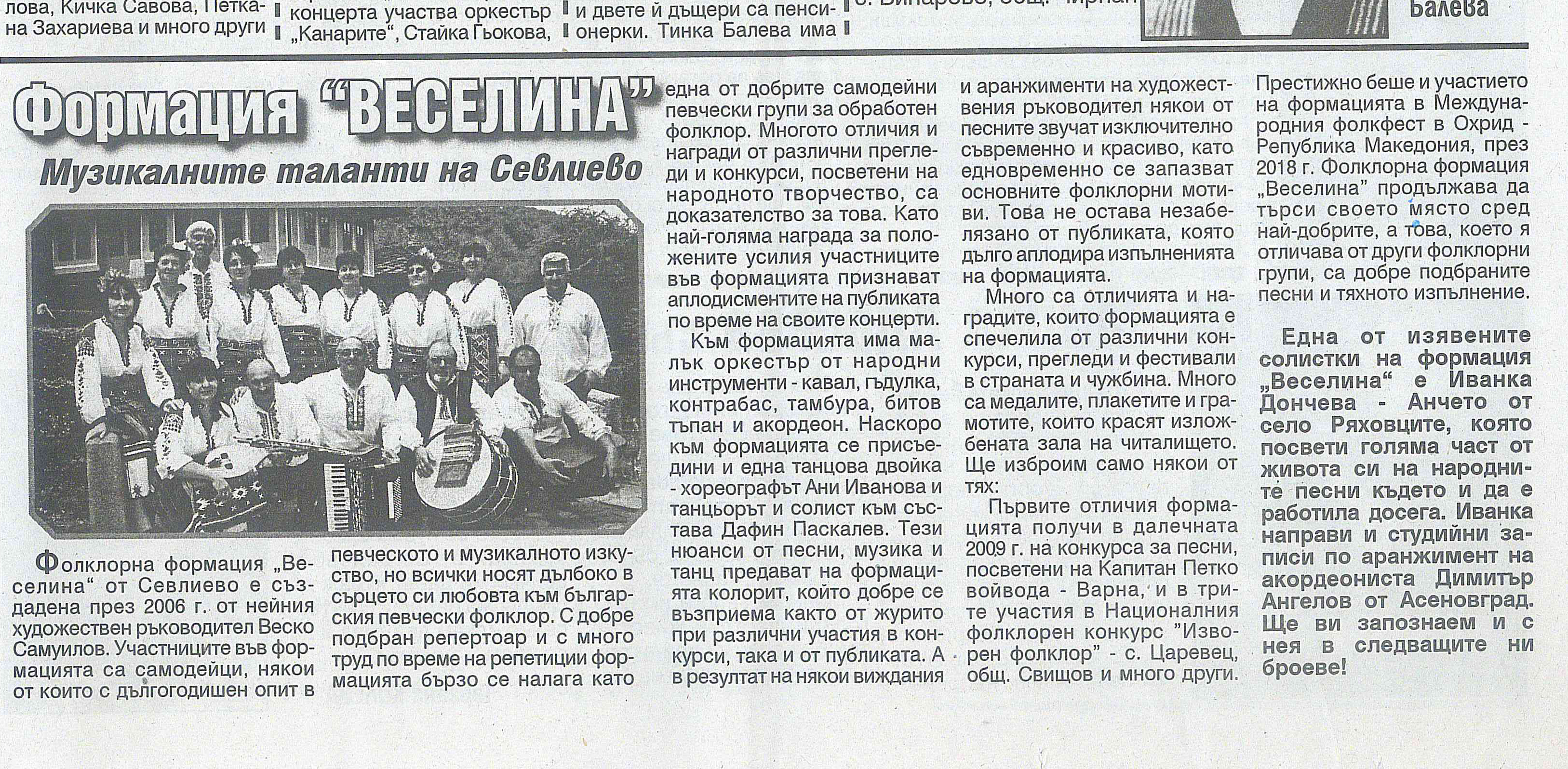 Със заглавие „Формация „Веселина“ – музикалните таланти на Севлиево“ в националното издание за българска народна музика – „Фолклорен хоризонт“, излезе статия за ръководената от Веско Самуилов група. В нея е описан животът и дейността на формацията й от самото й създаване, та до днес.
