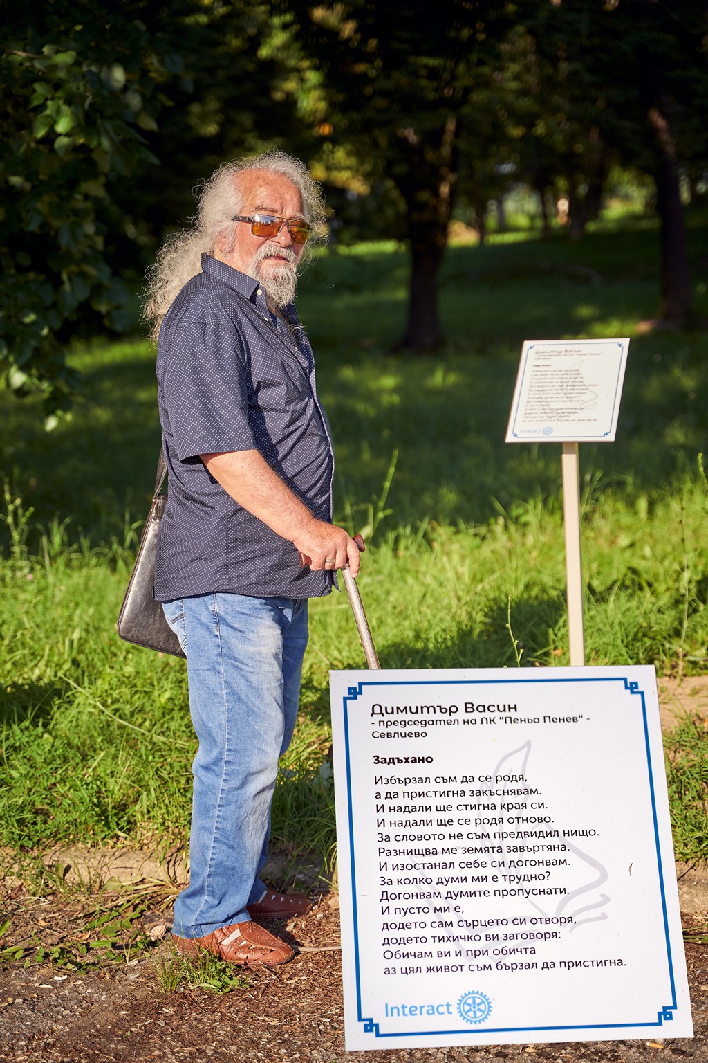 Всеки се е докосвал до поезията по един или друг начин – тя е навсякъде около нас и в нас самите, тя е колелото, което задвижва нашата душа, тя ни дава успокоение, почивка и красиво бягство от реалността. По тази причина Интеракт клуб – Севлиево реши да направи един поетичен подарък на града. Младите интерактори използваха събраната сума от ежегодния си мартенски базар, за да поставят 13 табели по двете алеи – към паметника в парк “Черничките”, върху които севлиевци имат възможността да прочетат най-нежните и любими стихове на членовете на литературен кабинет „Пеньо Пенев“ към НЧ “Развитие-1870”. Самият кабинет, носещ името на местния поет, известен още като Поетът с ватенката, освен обединител на творческите търсения на талантливите севлиевци, бе и неизменна част от организирането и провеждането на инициативата.