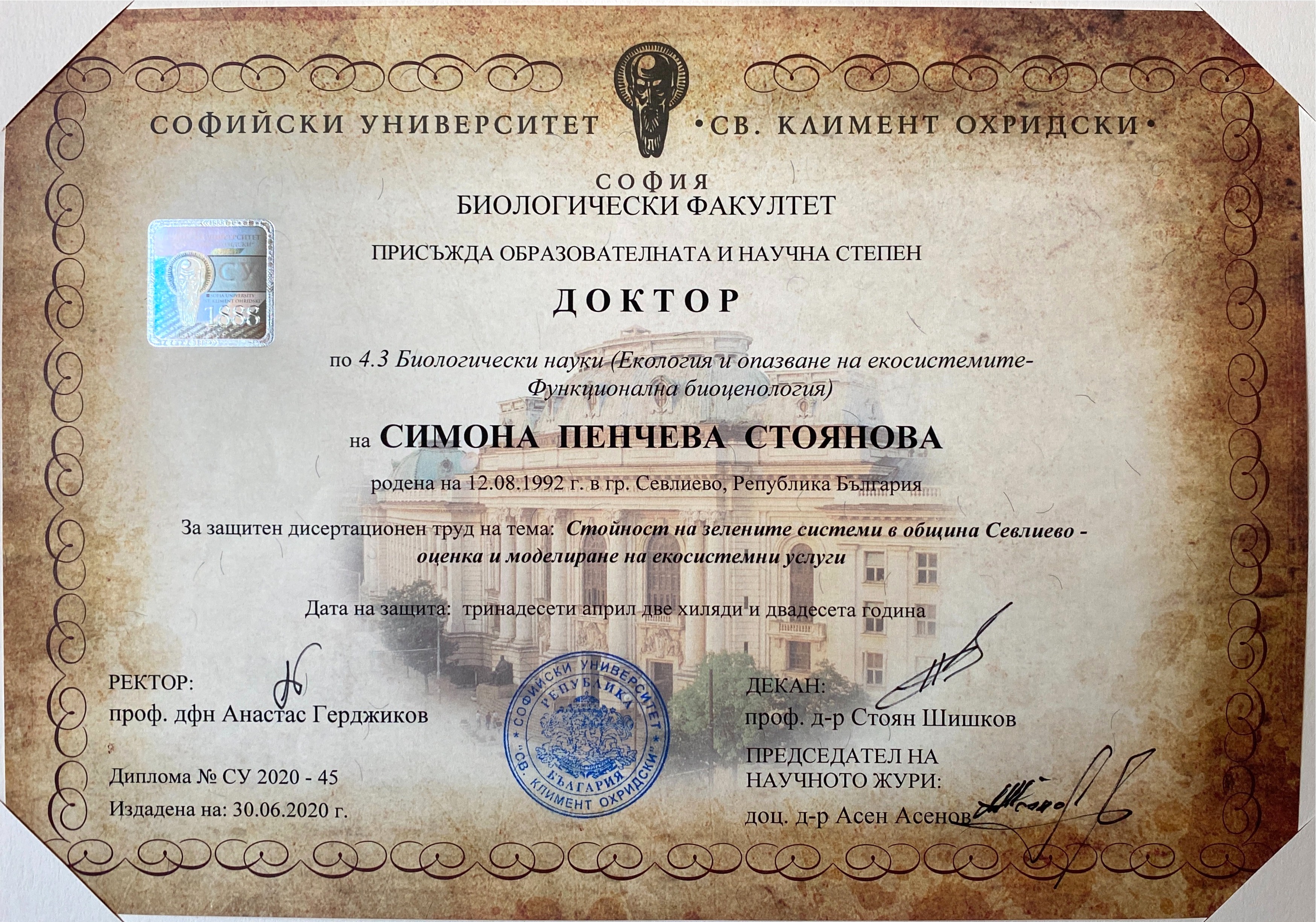 „Стойност на зелените системи в община Севлиево – оценка и моделиране на екоситемни услуги“. Това е темата на успешно защитения дисертационен труд на севлиевката Симона Стоянова, която от няколко дни вече е доктор на биологическите науки (Екология и опазване на екосистемите – функционална биоценология). Преди това, две поредни години, Симона бе носител на престижната награда в категория „Докторант на годината“ в конкурса „Студент на годината“ на Софийския университет.