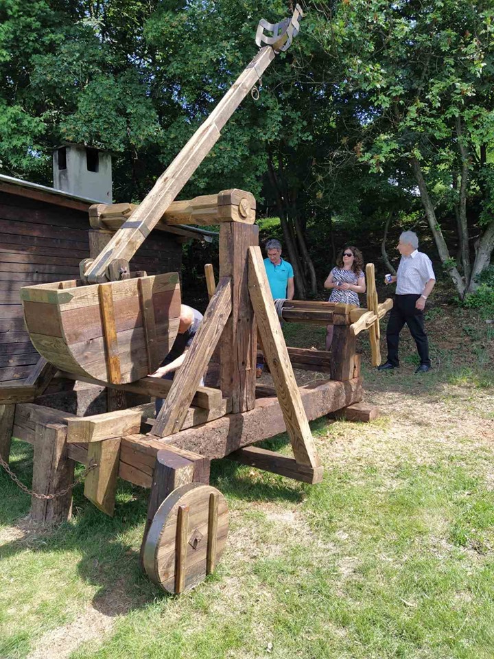 Внушителният с големината си катапулт е не само каменометка, но и огнеметка. Позициониран е до информационния център на Хоталич и за изработването му са били необходими две седмици. Плановете за съоръжението са дело на Найден Петров, който с чувство за хумор твърди, че в цялата Габровска област може би е единственият историк, който има представа и за техническата страна на метателните машини. Така или иначе, под неговото методическо ръководство местни дърводелци са работили и крайният резултат от идеята му и труда им е впечатляващ.
