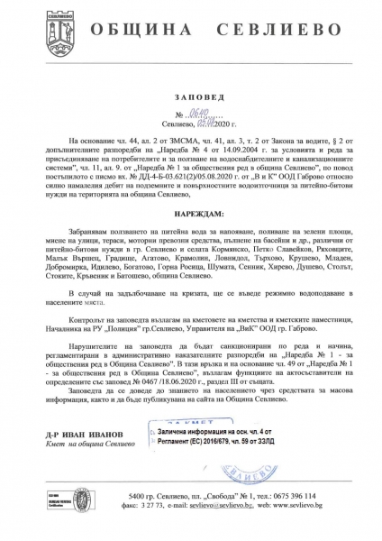 Контролът на заповедта се възлага на кметовете на кметства и кметските наместници, началника на РУ „Полиция” – Севлиево и управителя на „ВиК” ООД – Габрово.