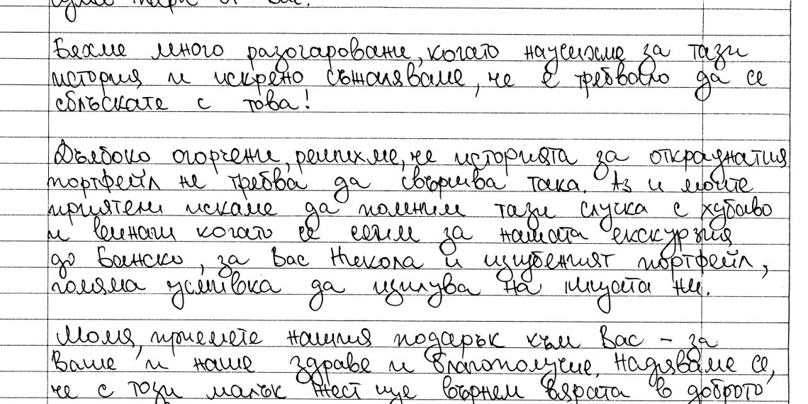 Каква беше моята изненада, когато отворих пратката, където освен личните документи, 5 човека с имена: Станимир, Живко, Тони, Ива и Габриела, бяха изпратили 250лв., т.е. всеки е дал по 50 лв., за да подпомогне ограбения пенсионер.
