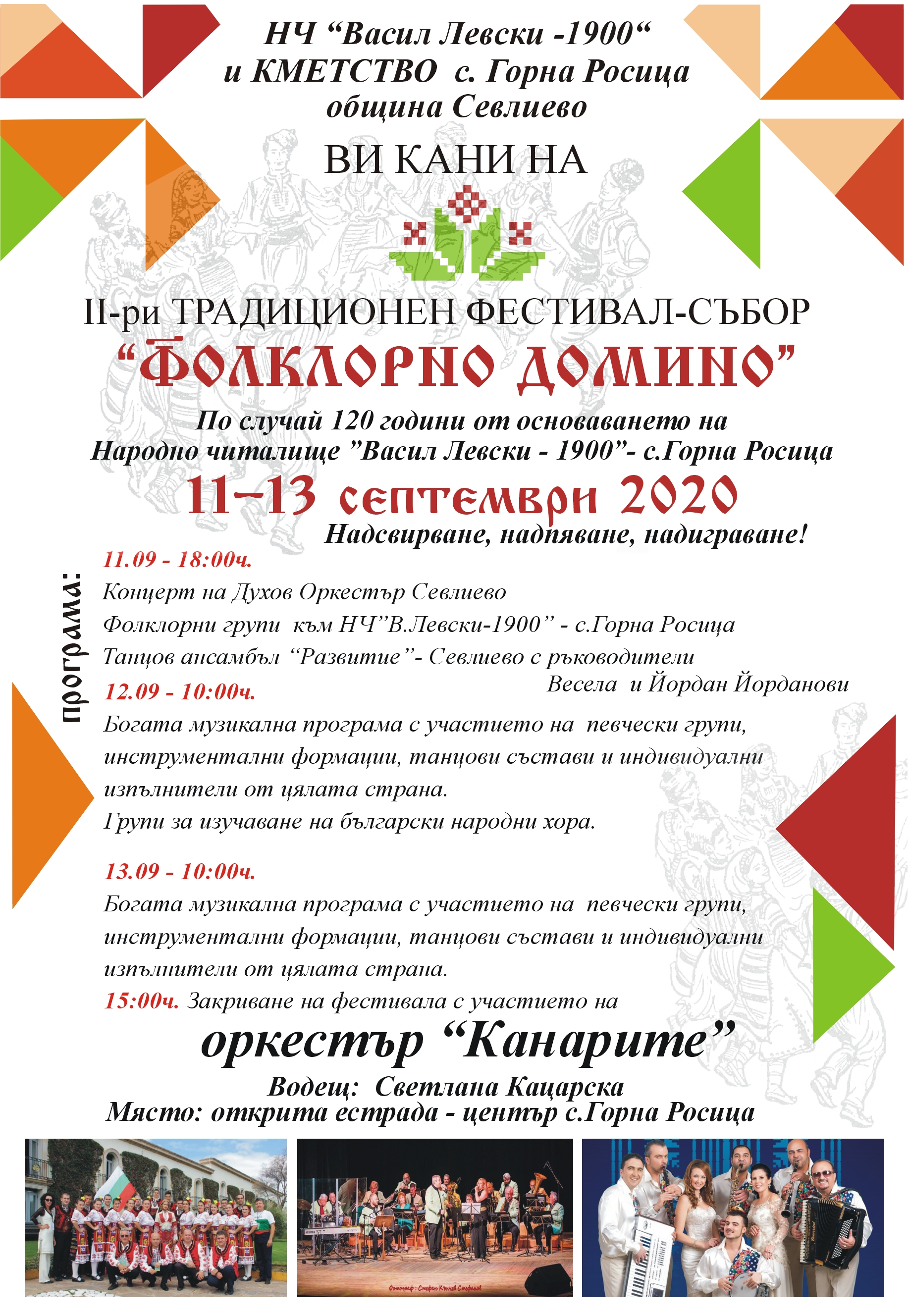 На тридневен двоен празник канят НЧ „Васил Левски – 1900“ и Кметство с. Горна Росица от 11 до 13 септември. Тогава в селото ще се проведе второто издание на традиционния фестивал-събор „Фолклорно домино“ и ще бъде отбелязана 120-годишнина от основаването на читалището в селото. Надсвирване, надпяване и надиграване са включени в богатата празнична програма.