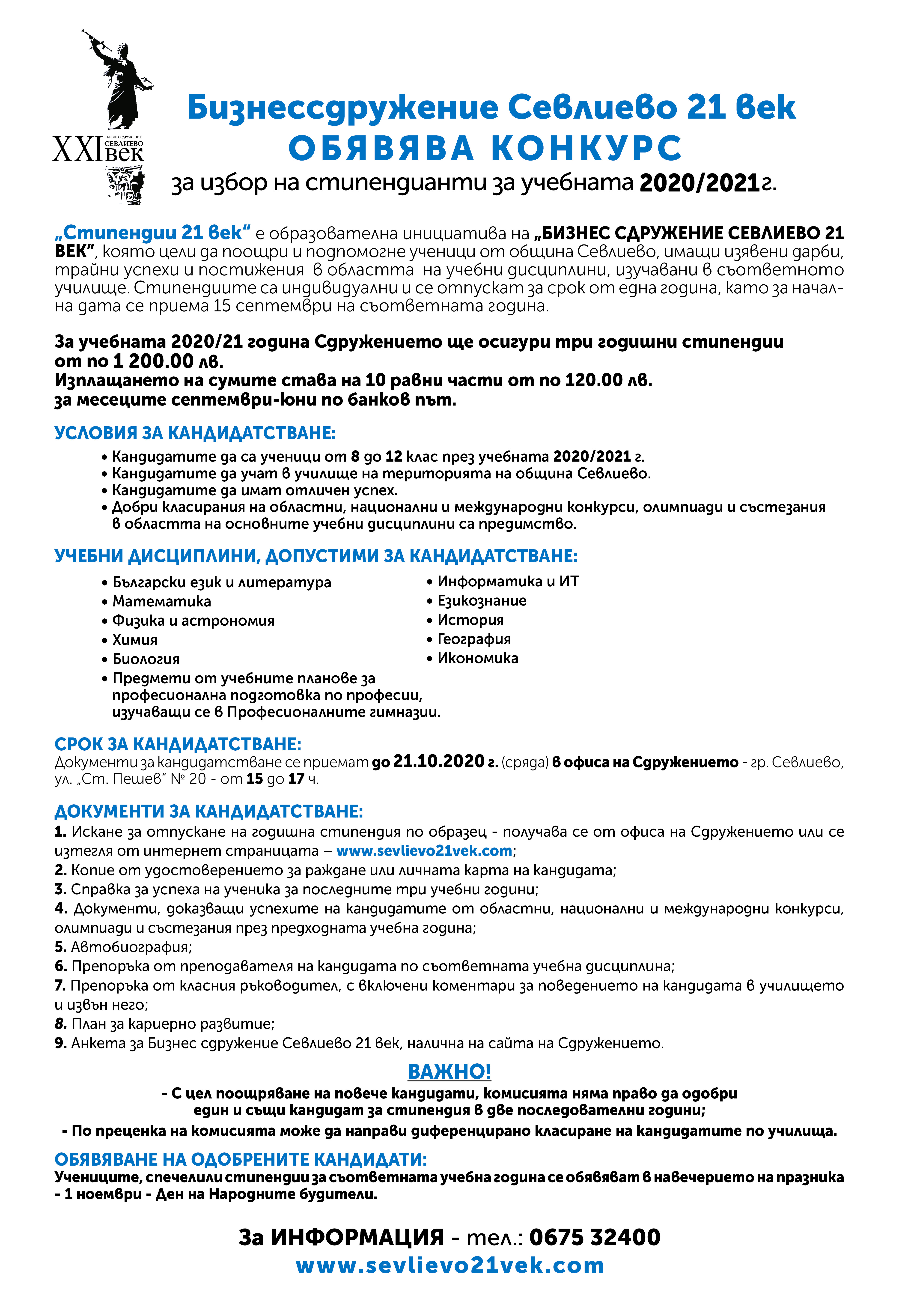 За осма поредна година бизнес сдружението „Севлиево 21 век“ ще предостави три стипендии по 1200 лв. през учебната 2020-2021 г. на средношколци от общината, които имат отличен успех, изявени дарби и трайни успехи и постижения в изучавани от тях учебни дисциплини. Стипендиите ще се изплащат на равни вноски през десетте учебни месеца от септември до юни. Това всъщност не е точно новина, защото образователната инициатива на сдружението е дългогодишна. Поредното потвърждение на този ангажимент обаче е добра вест за младите хора, които се целят по-високо от досега постигнатите си успехи.