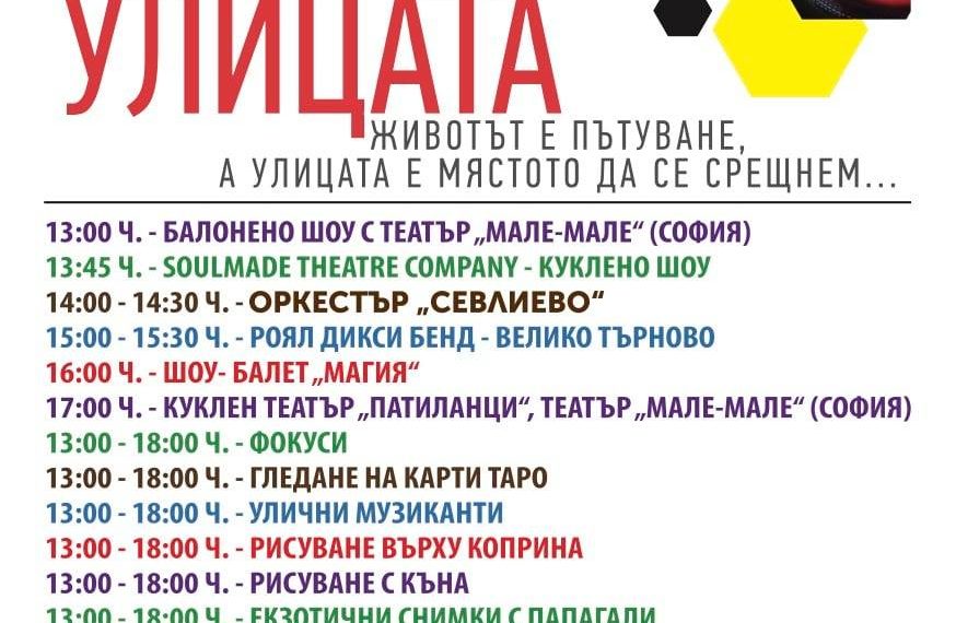 Пътуващият фестивал „Улицата“ отново ще гостува в Севлиево по време на XV-тия празник на тиквата. Мимове, клоуни, фокусници и актьори ще изпълнят града, а най-любопитните сред гостите ще се докоснат до загадките на руните и гледането на карти „Таро“, до театралното изкуство, грънчарството и рисуването върху вода.