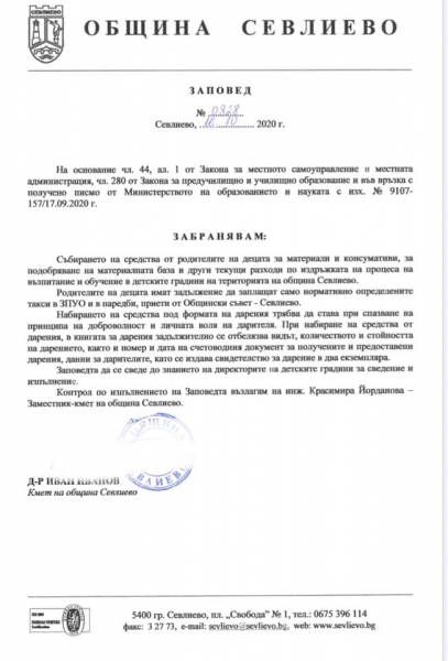 Кметът на община Севлиево д-р Иван Иванов издаде заповед, с която забранява събирането на средства от родителите на децата за материали и консумативи, за подобряване на материалната база и други текущи разходи по издръжката на процеса на възпитание и обучение в детските градини на територията на община Севлиево. Тя е във връзка с наскоро издадената заповед на министъра на образованието Красимир Вълчев в училищата и детските градини да не събират пари от родителите за допълнителни консумативи и подобряване на материалната база.