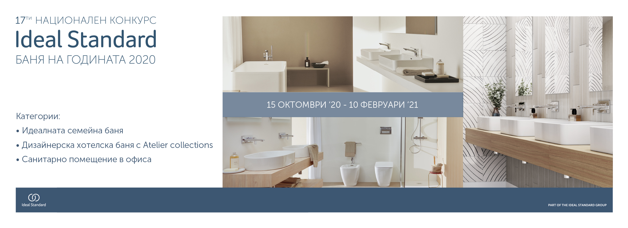 От 15 октомври за 17-и пореден път бе даден старт на престижния конкурс Ideal Standard „Баня на годината“. Три са категориите в него – „Идеалната семейна баня“, „Дизайнерска хотелска баня с Atelier Collections“ и „Санитарно помещение в офиса“. Българските архитекти и дизайнери трябва да представят своите решения в 3D визуализации до 10 февруари 2021 година.