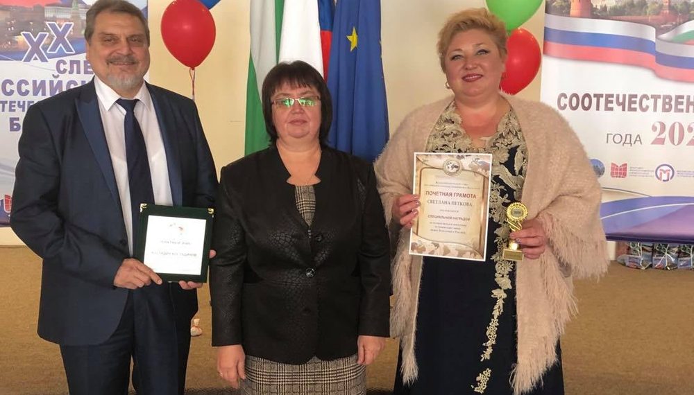 Координационният съвет на федерацията връчи наградите на двамата ни съграждани. Светлана Петкова получи грамота и вимпел в категорията „За специален принос в укрепването и развитието на историческите връзки между Русия и България“, а Костадин Костадинов бе удостоен с „Почетен знак на координационния съвет на руските сънародници в България“.