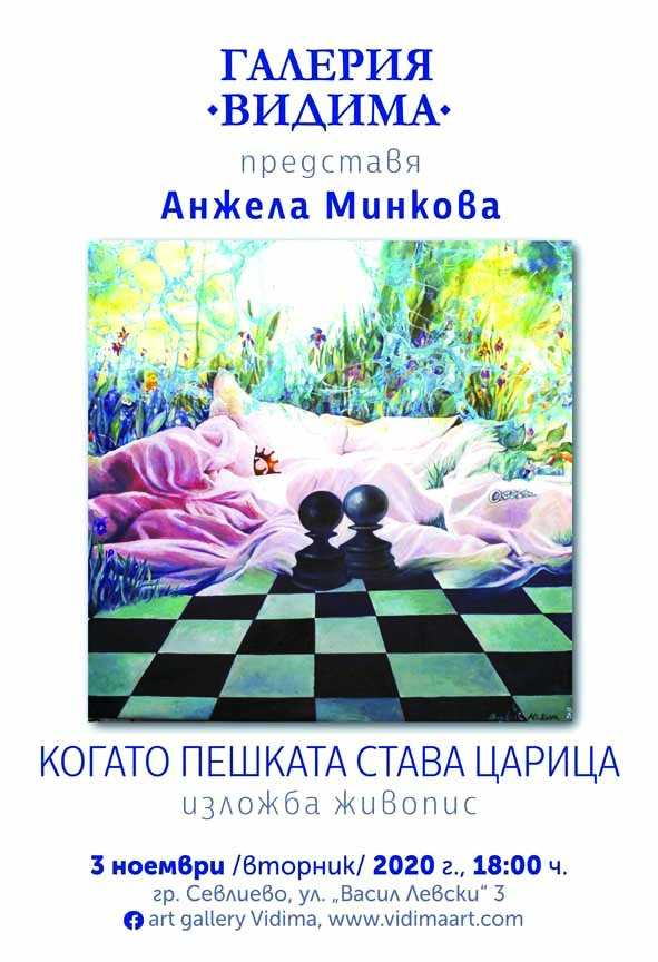„Когато пешката става царица“ е озаглавена изложбата на Анжела Минкова, която ще бъде открита утре в 18 часа в галерия „Видима“. Това е второто нейно гостуване в Севлиево – точно десет години по-рано тя бе представена за пръв път тук.