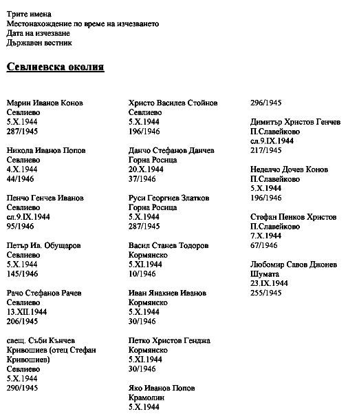 Според тези документи безследно изчезнали в Севлиевска околия след 9 септември 1944 г. са около 29 души. Сред тях са бившият кмет, архиерейският наместник в Севлиево, търговци, фабриканти, адвокати, учители, чиновници и земеделци от другите населени места в околията.
