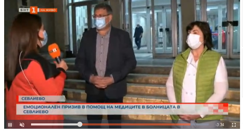 “Ние от болницата се обръщаме към всички, които имат възможност и чувстват необходимост да изпълнят мисията си в помощ на медиците и пациентите по време на тази пандемия. Имаме остра нужда от доброволци и недостиг на персонал. Искрено вярваме, че апелът ни ще стигне до сърцата на призваните да се притекат на помощ”, се казва в призива на медиците от МБАЛ “Д-р Стойчо Христов” в Севлиево, станал повод за репортажа по БНТ.