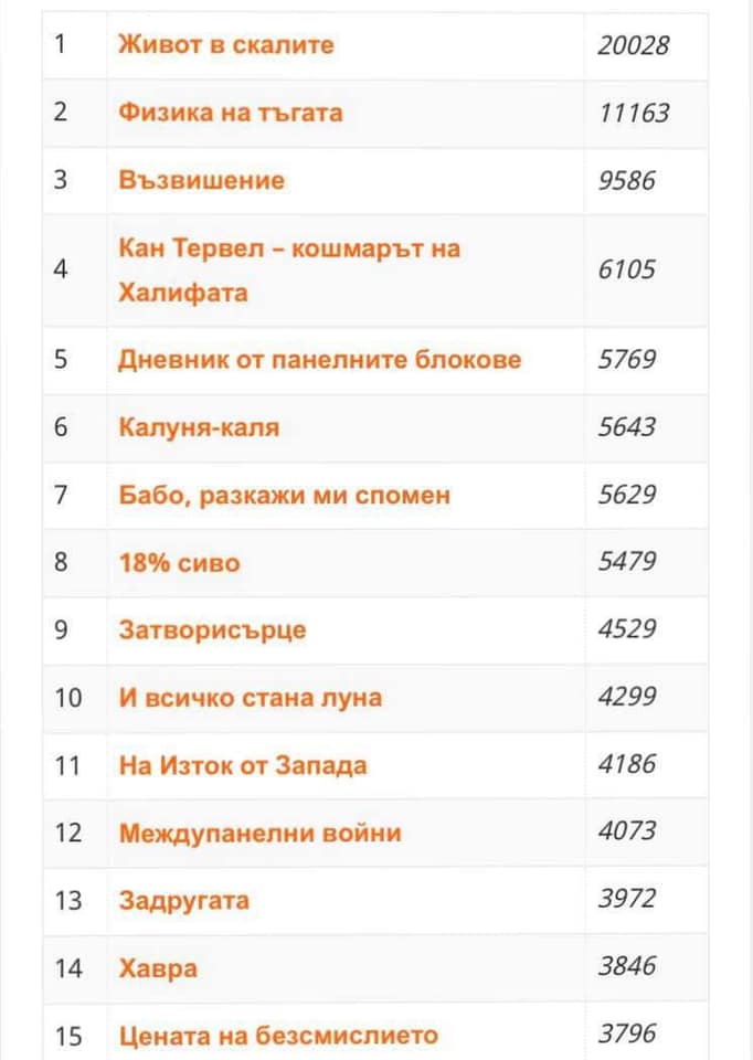 Радващо е, че втора по брой на продажби е „Деца играят вън“ на Георги Данаилов, което показва, че пазим словото му – няколко години, след като ни напусна. Веднага след него се нарежда най-успешната българска книга напоследък – „Живот в скалите“ на Мария Лалева.