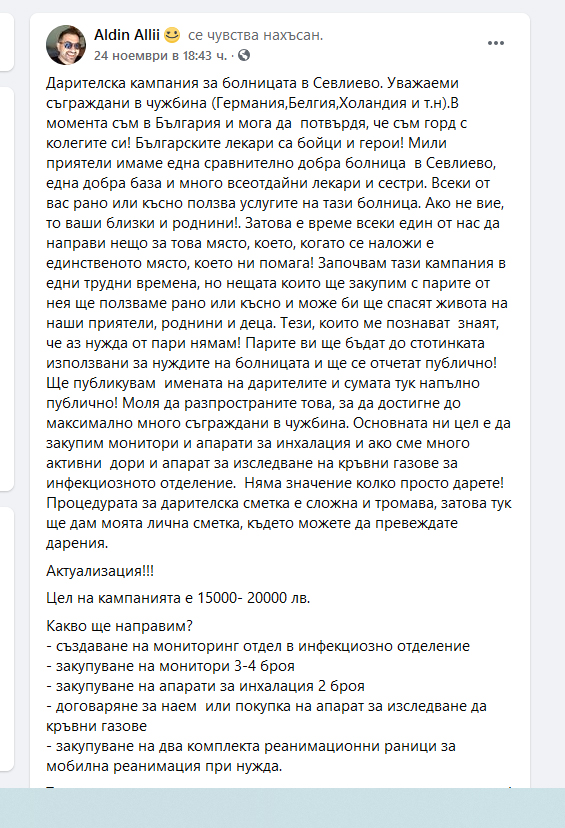 Тези, които ме познават знаят, че аз нужда от пари нямам! Парите ви ще бъдат до стотинката използвани за нуждите на болницата и ще се отчетат публично! Ще публикувам имената на дарителите и сумата тук напълно публично! Моля да разпространите това, за да достигне до максимално много съграждани в чужбина. Основната ни цел е да закупим монитори и апарати за инхалация и ако сме много активни дори и апарат за изследване на кръвни газове за инфекциозното отделение. Няма значение колко просто дарете! Процедурата за дарителска сметка е сложна и тромава, затова тук ще дам моята лична сметка, където можете да превеждате дарения” – написа на смвоята Фейсбук страница д-р Алдин Али.