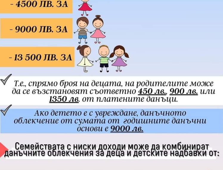 Спрямо броя на децата, на родителите може да се възстановят съответно 450 лв., 900 лв. или 1350 лв. от платените данъци. Ако детето е с увреждане, данъчното облекчение от сумата от годишните данъчни основи е 9000 лв. Семействата с ниски доходи могат да комбинират данъчните облекчения за деца и детските надбавки – 40 лв. на месец за едно дете, 90 лв. за две деца и 135 лв. за три деца.