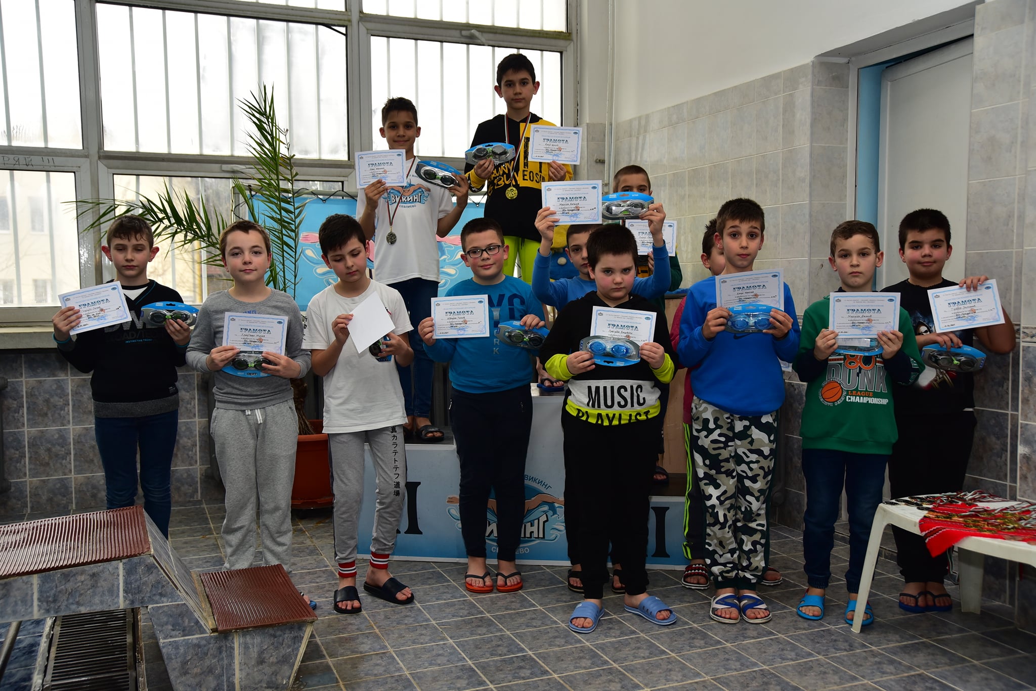 Медали получиха първите трима състезатели от всяка възрастова група и пол, а маркови плувни очила бяха поощрението за всички участници от възрастови групи „Златна рибка“ и „Весел делфин“.