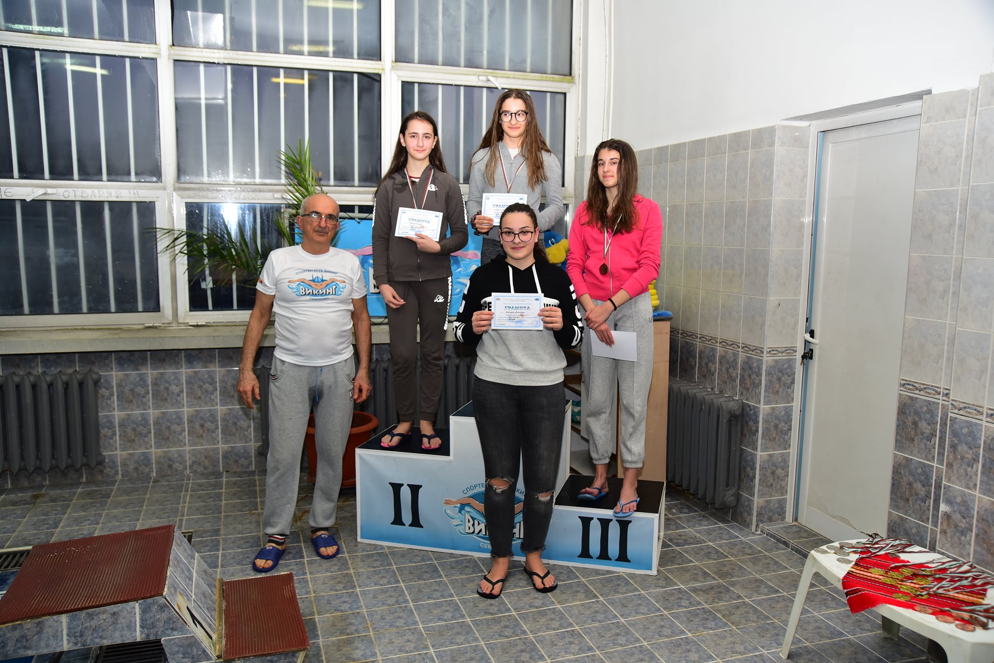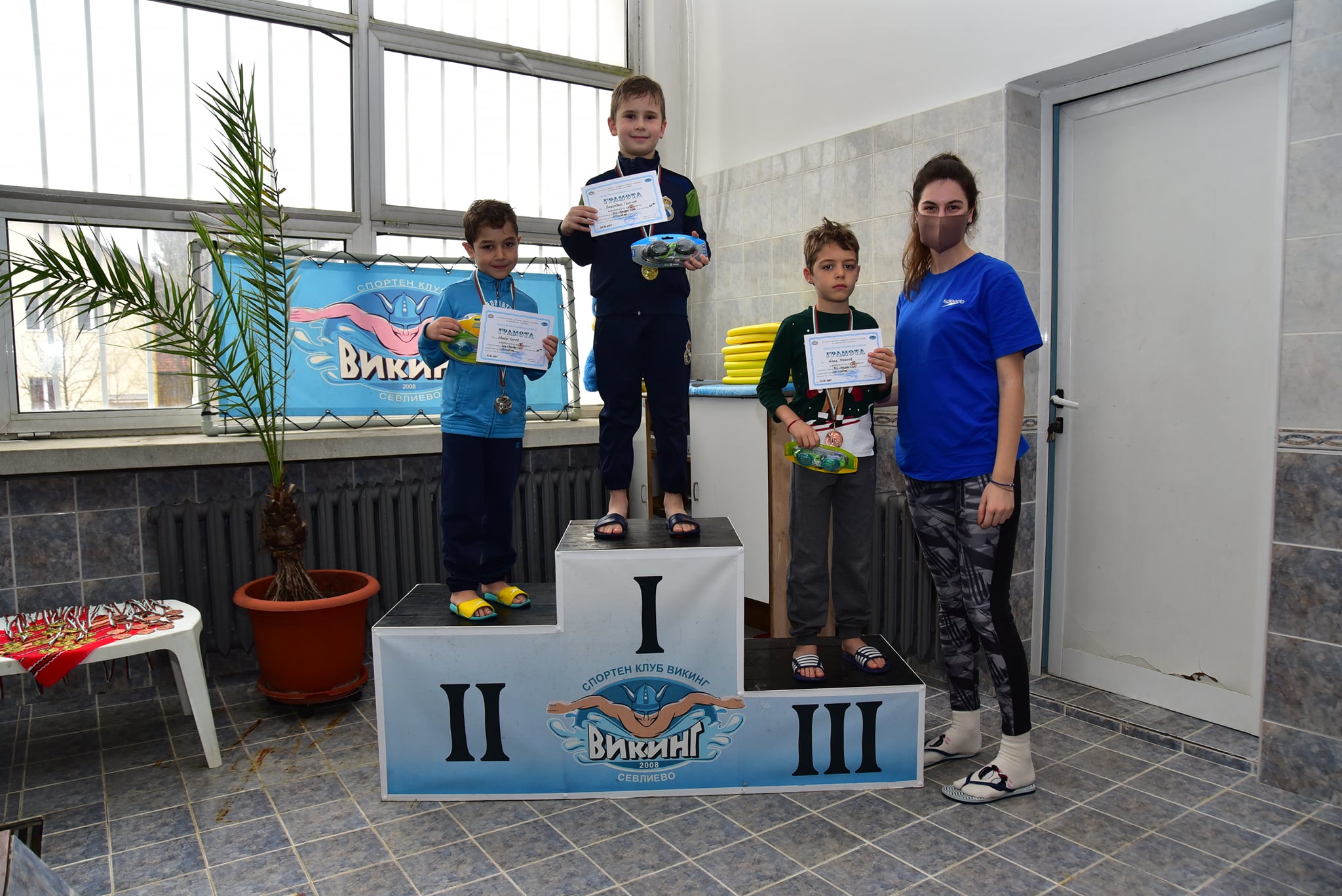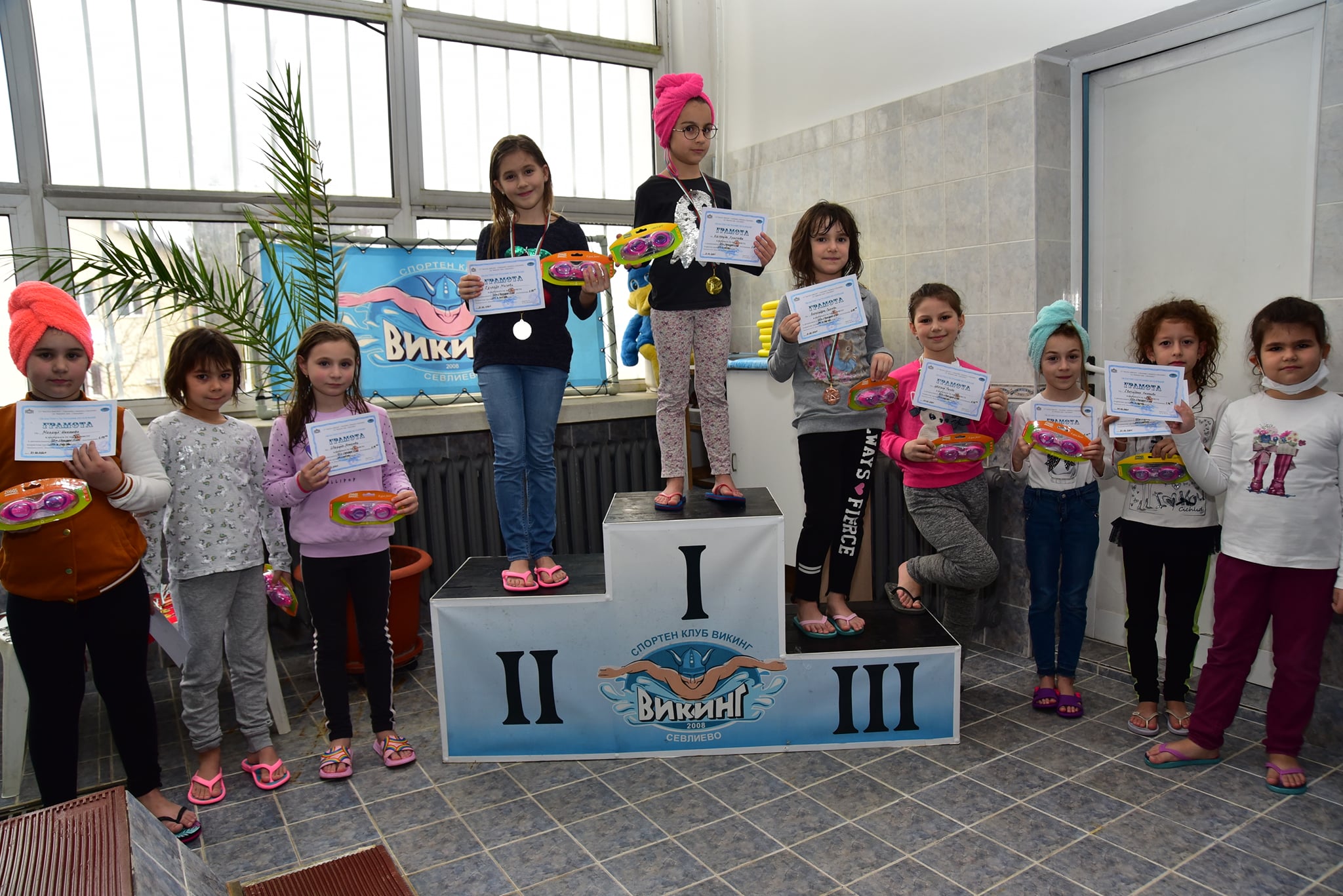 Медали получиха първите трима състезатели от всяка възрастова група и пол, а маркови плувни очила бяха поощрението за всички участници от възрастови групи „Златна рибка“ и „Весел делфин“.