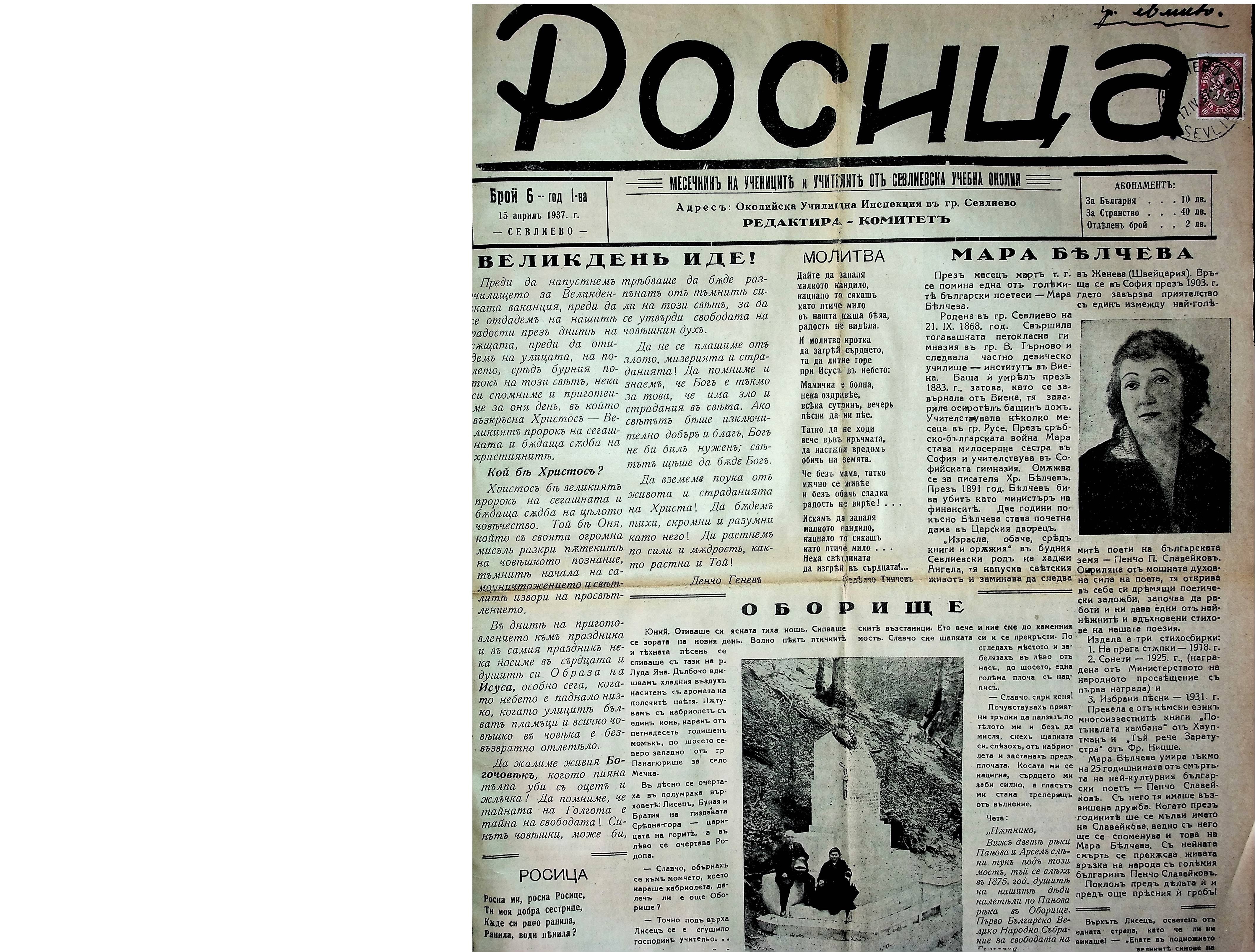 През месец март, т.г. се помина една от големите български поетеси Мара Белчева, съобщава на първата си страница от април 1937 г. в. “Росица” – месечник на учителите и учениците от Севлиевска околия.