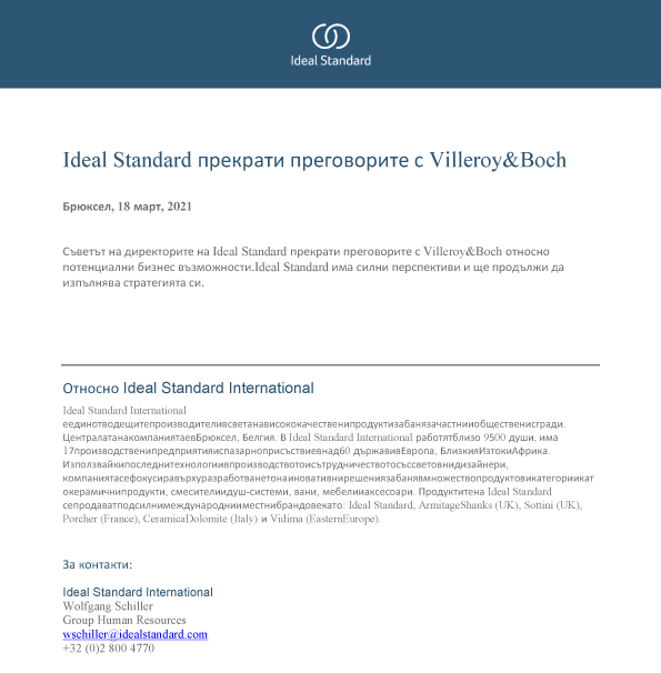 “Съветът на директорите на Ideal Standard прекрати преговорите с Villeroy & Boch относно потенциални бизнес възможности.Ideal Standard има силни перспективи и ще продължи да изпълнява стратегията си”, съобщават от централата на компанията в Брюксел.
