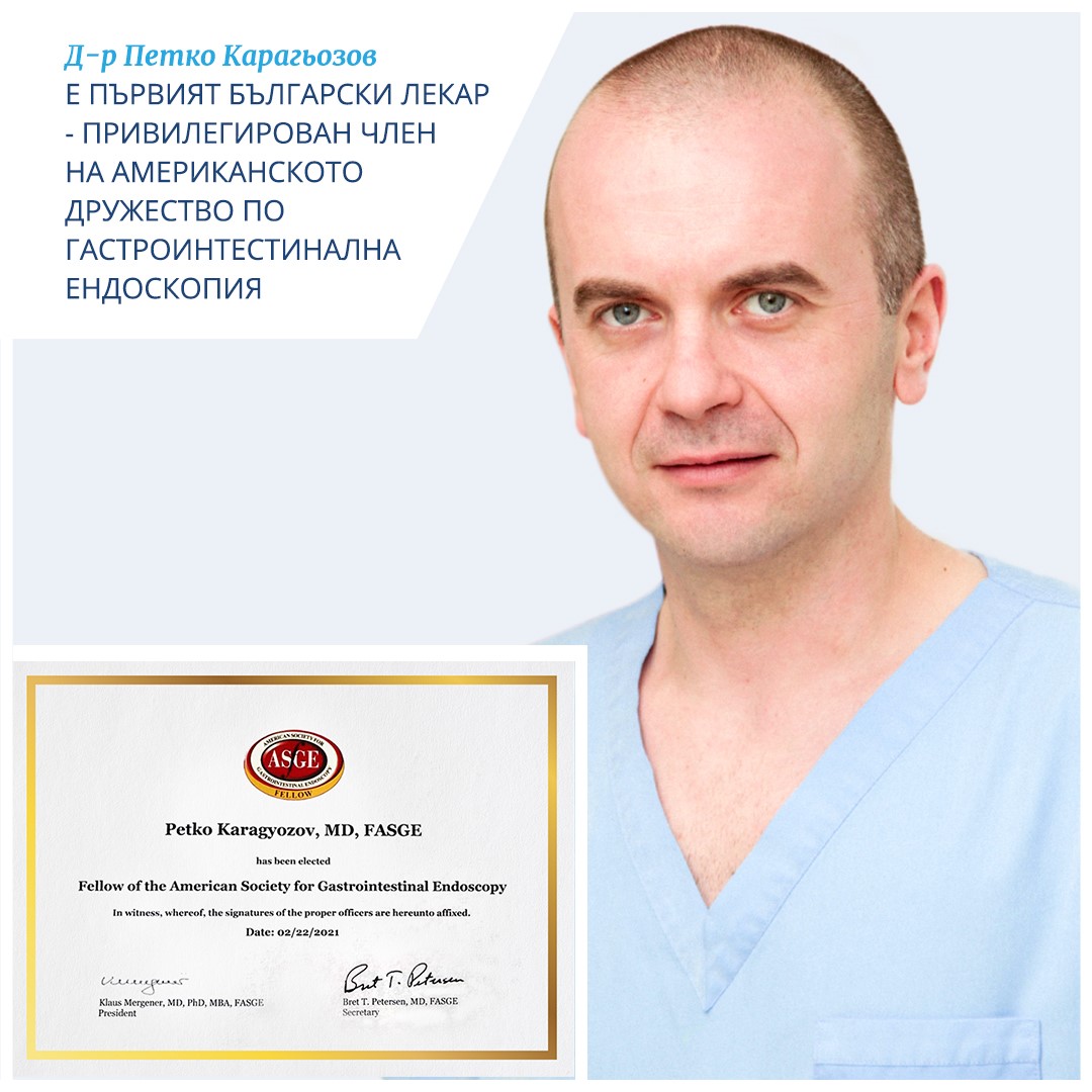 Началникът на отделението по Интервенционална гастроентерология в Аджибадем Сити Клиник Болница Токуда д-р Петко Карагьозов, се присъедини официално към световния елит на гастроентерологичните ендоскопски специалисти, след като получи титлата “привилегирован член” на Американското дружество по гастроинтестинална ендоскопия (ASGE) – Fellow of the American Society of Gastrointestinal Endoscopy – FASGE. Това съобщи официалният сайт на болницата.