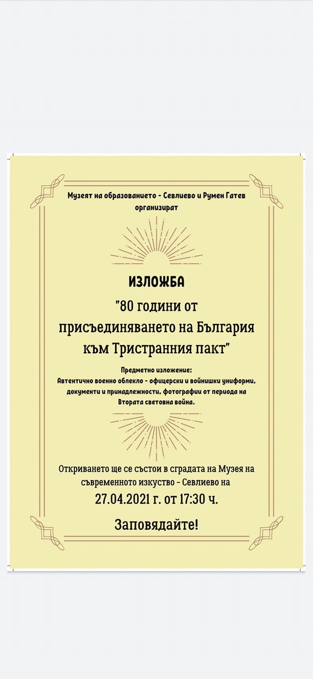 Темата на изложението е свързана с 80-ата годишнина от присъединяването на България към Тристранния пакт, с което страната ни се замесва в най-големия въоръжен конфликт в историята на света. Историята помни, че на 1 март 1941 г. българският министър-председател проф. Богдан Филов и германският външен министър Йоахим фон Рибентроп подписват във Виена протокола за присъединяването – след година и половина запазване на неутралитет от Царство България. Какви са последствията от това решение и как те предначертават бъдещето на страната ни? Повече информация за това ще даде дванайсетокласникът от СУ „Васил Левски“ – Румен Гатев . Откриването на изложбата е предвидено за 27 април, от 17:30 ч.