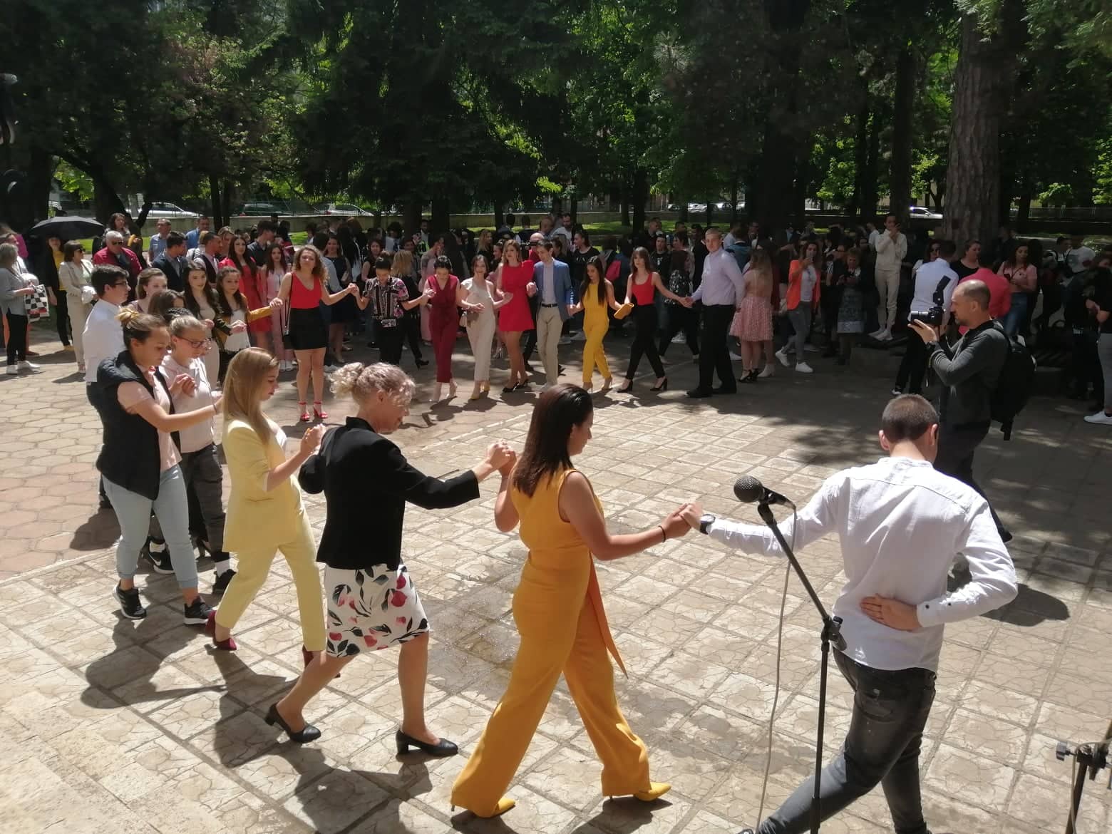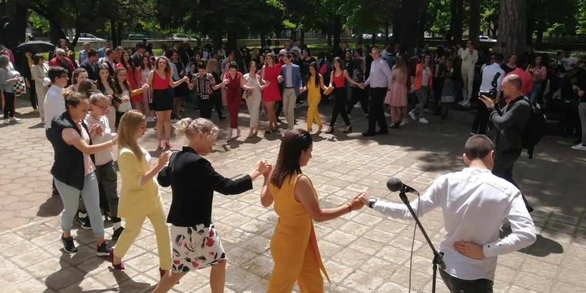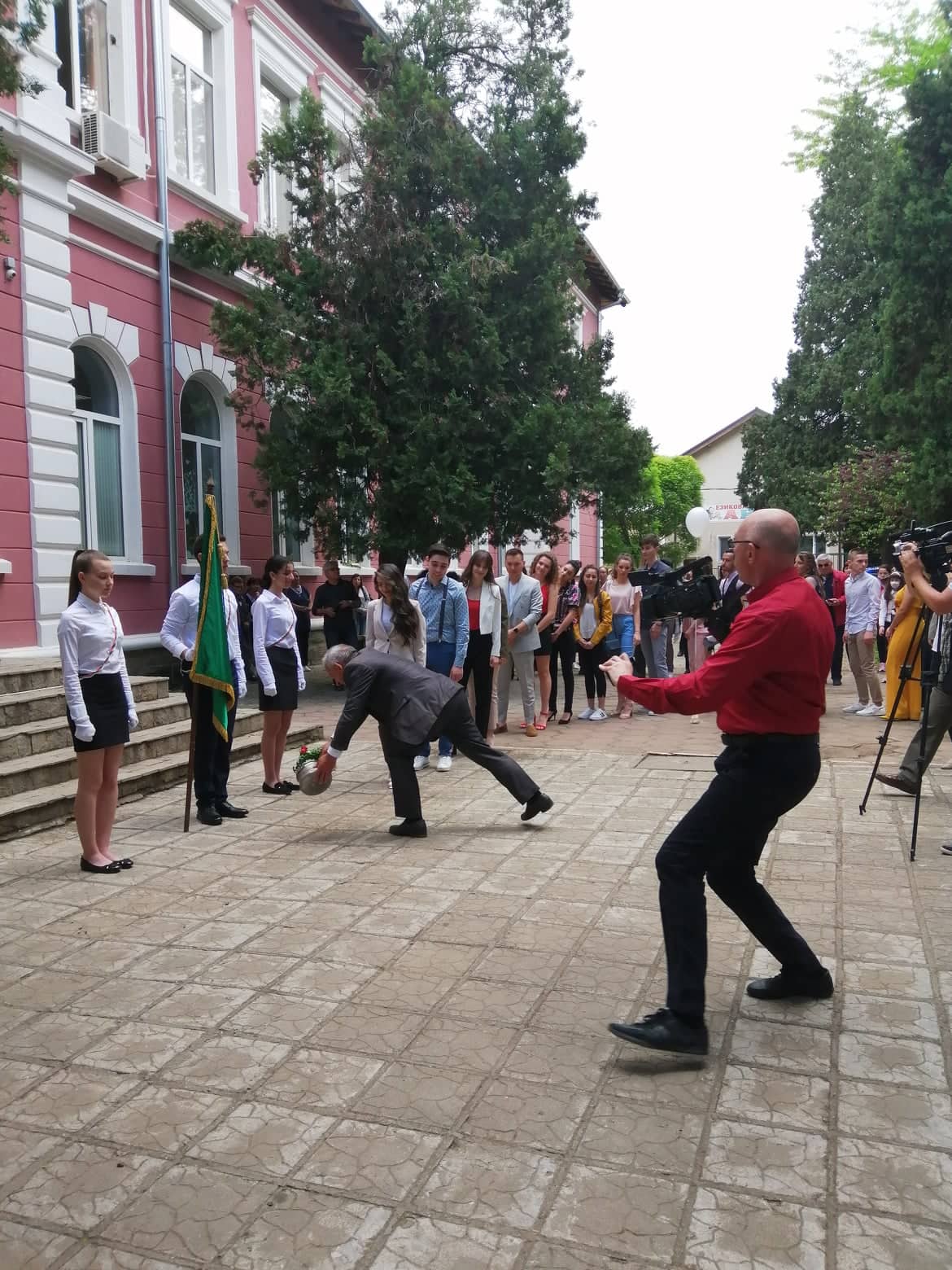 Дванадесетокласниците се простиха с училищното знаме и в знак на почит и признателност поднесоха цветя пред бюст-паметника на патрона на училището – Васил Левски. Отправяйки поглед нагоре, абитуриентите пуснаха балони в небето, където са мечтите им. Накрая всички символично се хванаха на дълго българско хоро.