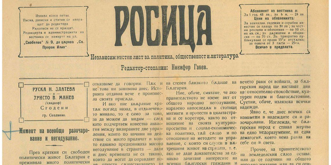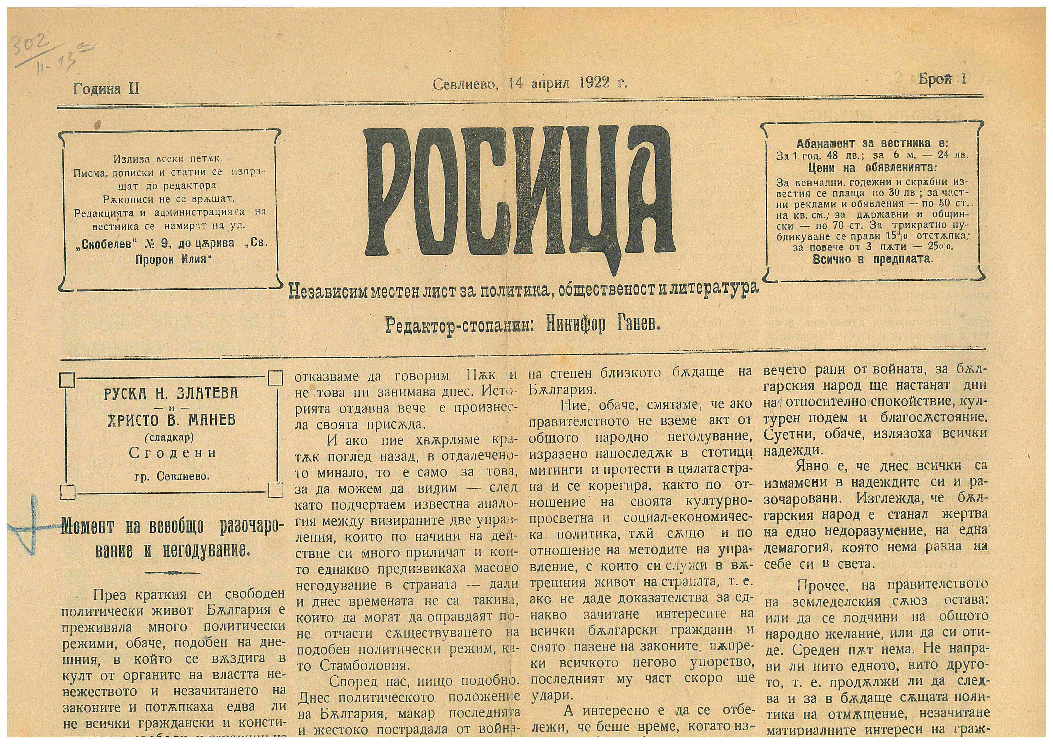 Учителите Евтим Дабев, Петю Мустаков и Тодор Постомпиров, стигнали до убеждението, че трябва да се изоставят старите идеи и се започне пропаганда на новите идеи с издаването от 4 юни 1886 г. на първият социалистически в. „Росица”. Някой автори твърдят, че вестникът е наименуван на преминаващата през Севлиево р. Росица, откъдето е първият редактор на вестника Петю Мустаков. Партийният деец Георги Бакалов през 1922 г. изтъкнал, че названието на вестника е от сутрешната роса, която освежава земята… и предвещава настъпването на „новия ден”. В брой 2 на в. „Росица” Евтим Дабев /Дружелюб/ пише, че вестникът има за цел до разкрие причините за пролетаризирането на занаятчиите и селяните, да свести и защити работниците. „Ние станахме вестникари да защитим според силите си сиромасите… да облекчим бедствията им, да помогнем в борбата”.