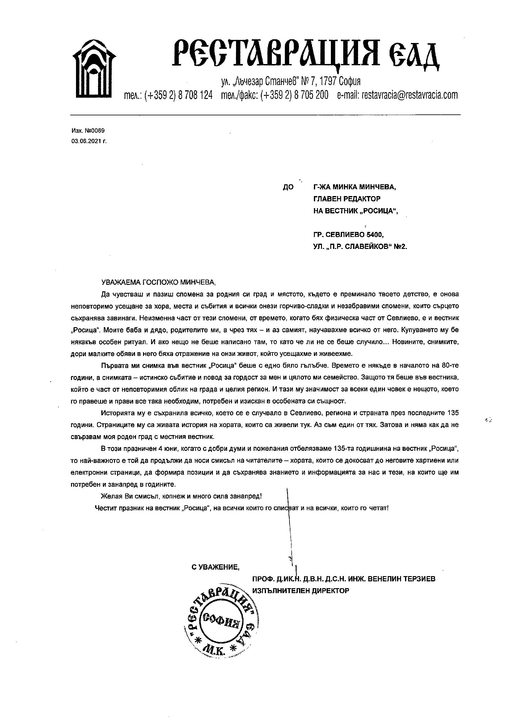 Да чувстваш и пазиш спомена за родния си град и мястото, където е преминало твоето детство, е онова неповторимо усещане за хора, места и събития и всички онези горчиво-сладки и незабравими спомени, които сърцето съхранява завинаги. Неизменна част от тези спомени, от времето, когато бях физическа част от Севлиево, е и вестник „Росица“. Моите баба и дядо, родителите ми, а чрез тях – и аз самият, научавахме всичко от него. Купуването му бе някакъв особен ритуал. И ако нещо не беше написано там, то като че ли не се беше случило… Новините, снимките, дори малките обяви в него бяха отражение на онзи живот, който усещахме и живеехме.